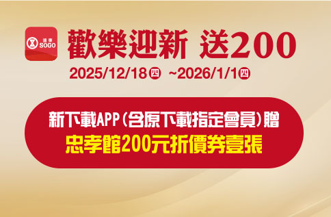 點我觀看台北忠孝館-歡新快樂送200元折價券 2025/12/18 ~ 2026/1/1