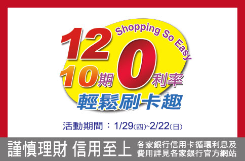 ●12期免息分期:單筆刷卡滿12,000元(含)以上,即可辦理12期免息分期零利率優惠。