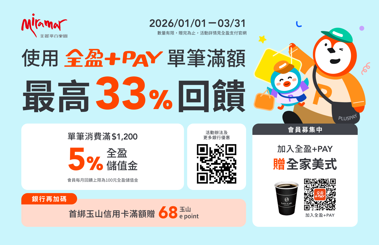 點我觀看全盈Pay最高22%全盈Pay新上線-消費不限金額享7%回饋活動時間:2025/8/25-2025/10/1活動期間內,於美麗華使用全盈+PAY付款(信用卡/簽帳金融卡/銀行帳戶皆適用),單筆消費不限金額享7%全盈儲值金回饋。※活動期間回饋總金額上限為125,000元整※活動期間每一全盈支付..