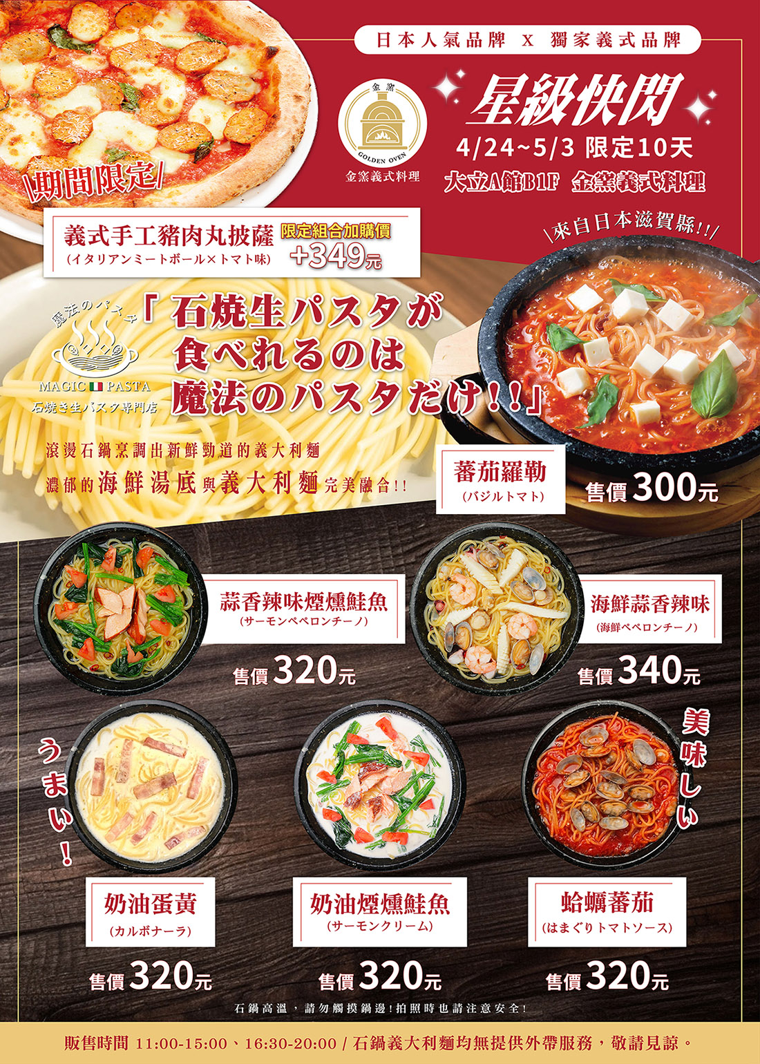 快閃地點|大立A館B1F【金窯義式料理】《魔法のパスタ》日本人氣石鍋義大利麵特色餐廳