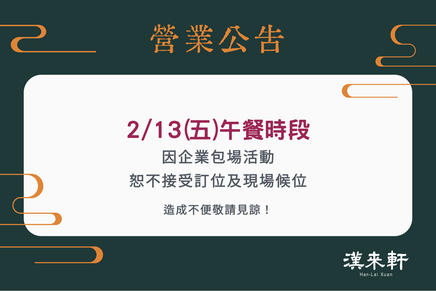 漢來優惠活動 - 《漢來軒》營業公告:2026年2月部分日期因企業包場活動,恕不開放訂位