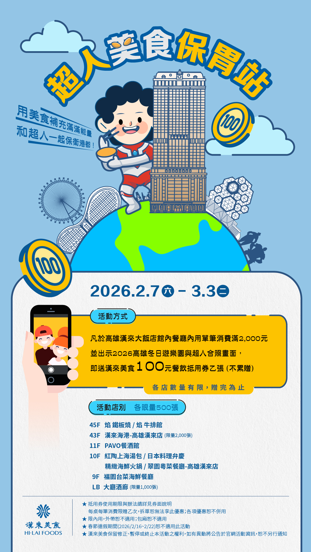 漢來優惠活動 - 《漢來美食》超人美食保胃站:2026/2/7(六)~3/3(二) 於高雄漢來大飯店館內餐廳完成指定任務,即送漢來美食100元餐飲抵用券乙張(不累贈)