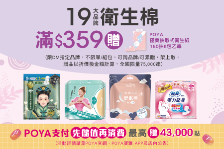 點我觀看POYA寶雅 - 19大品牌衛生棉商品滿$359贈POYA極美抽取式衛生紙150抽6包乙串