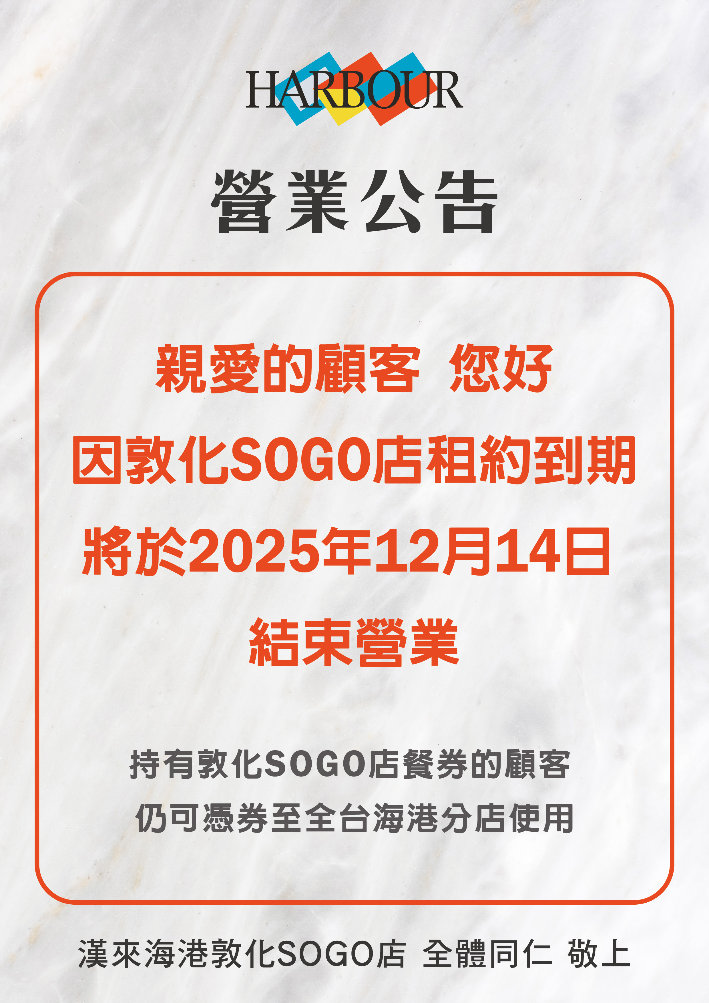 漢來優惠活動 - 《漢來海港 - 敦化SOGO》營業調整公告:敦化SOGO店將於2025/12/14結束營業,持有漢來海港敦南店餐券的顧客,憑券可至全台海港繼續使用。