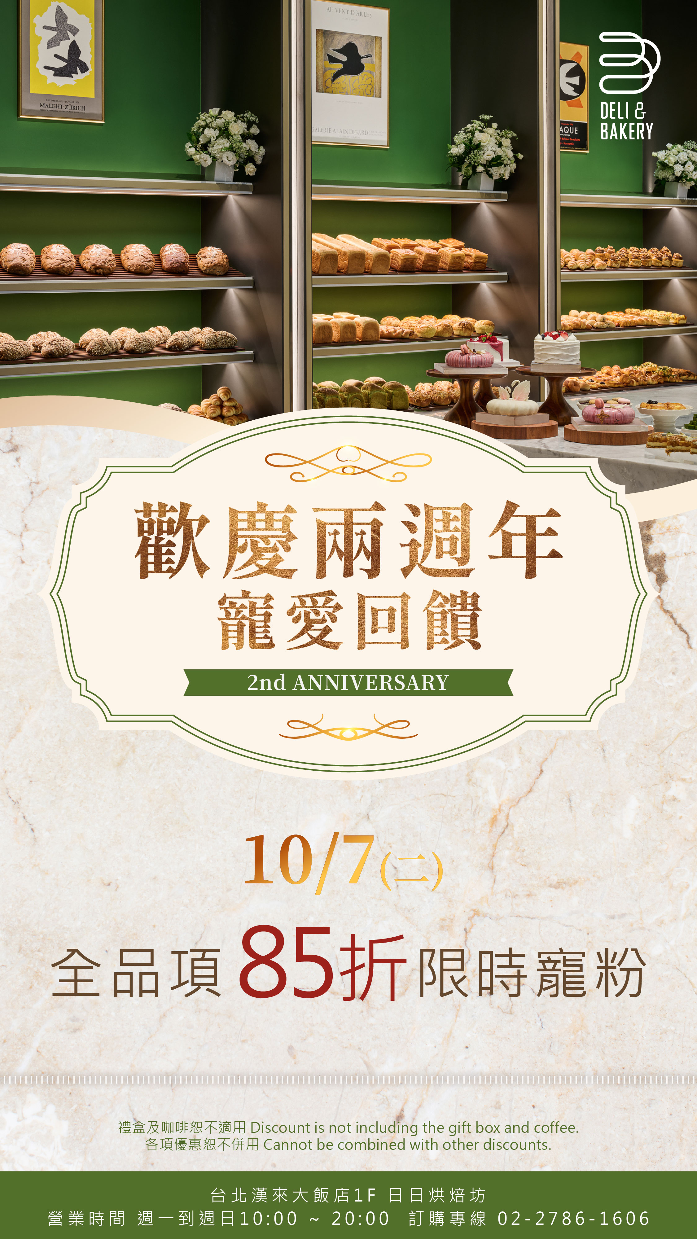點我觀看漢來優惠活動 - 《日日烘焙坊》歡慶兩週年 寵愛回饋:歡慶兩週年2025/10/7 (二)全品項85折優惠限時寵粉!!