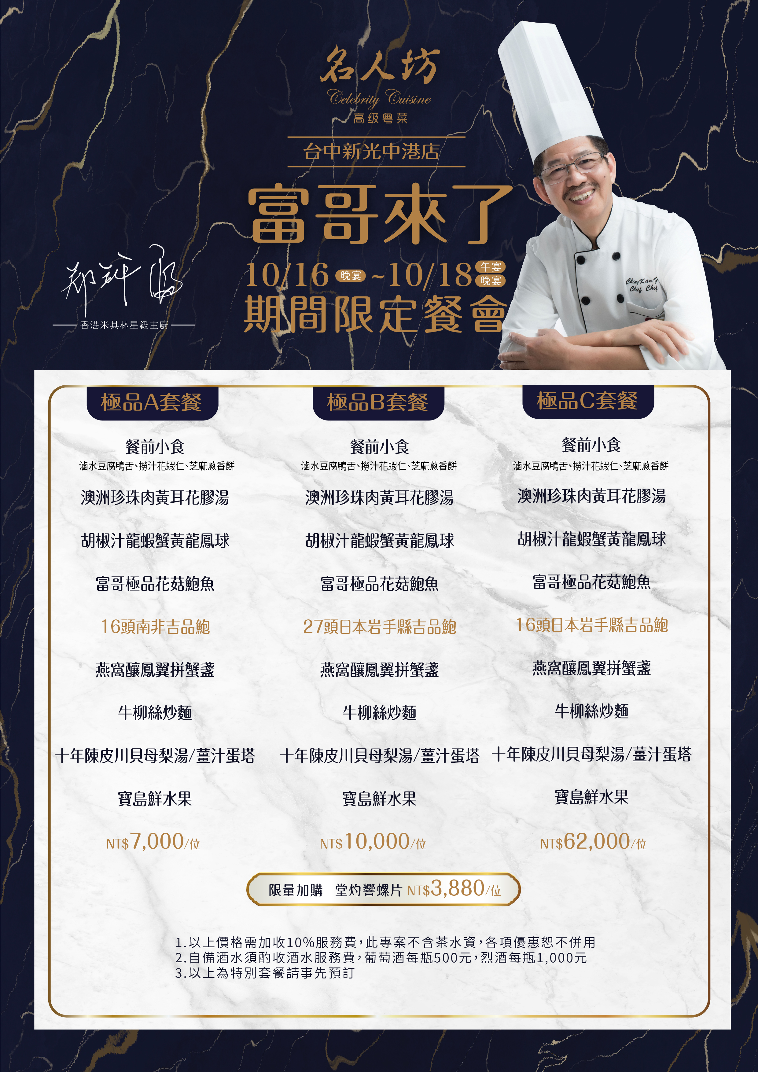 漢來優惠活動 - 《漢來名人坊》台中新光中港店-富哥來了:10/16(晚宴) ~ 10/18(午宴&晚宴)│台中新光中港店 期間限定餐會✨