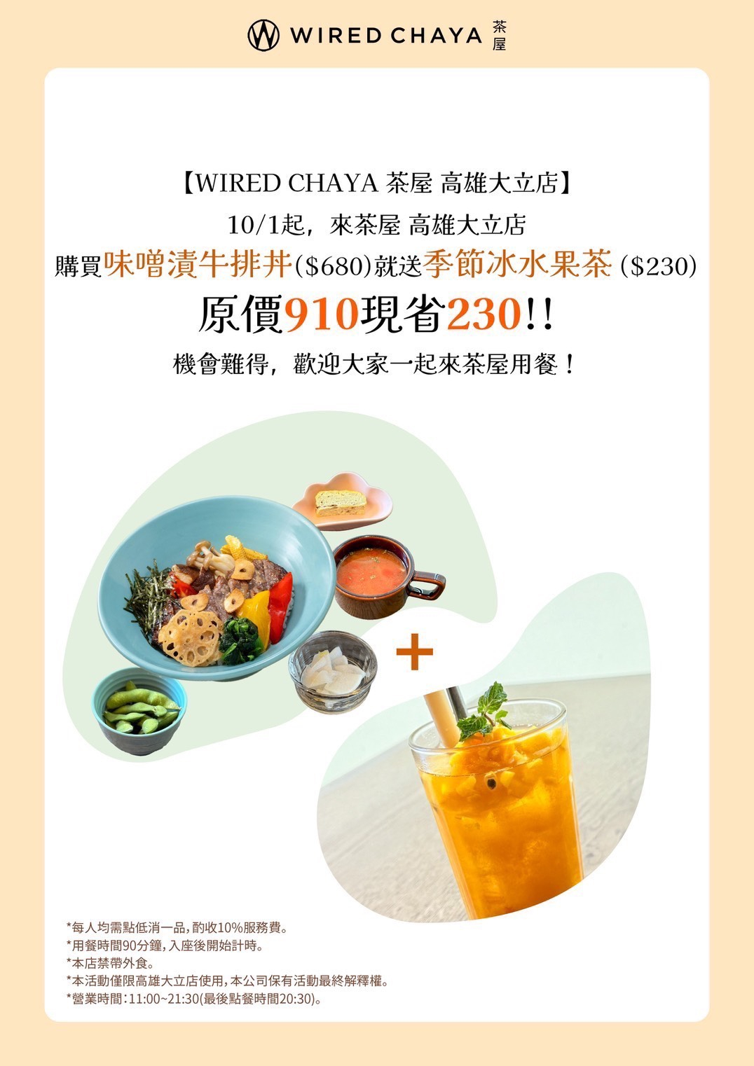 10/1起,來茶屋高雄大立店,購買味噌漬牛排丼($680元)就送季節冰水果茶 ($230元)