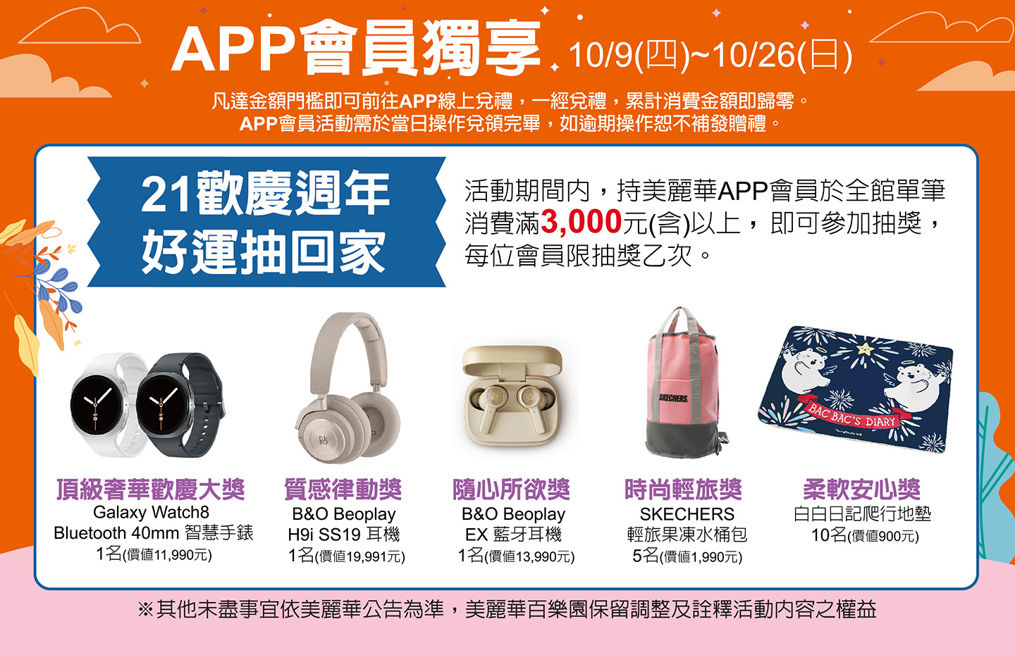 點我觀看20週年VIP回饋禮活動期間內,當日於全館消費累計滿180,000元,即可兌換3,000元商品券。※限量15份,送完為止。※珠寶區(點石齋、引雅、展岱、翠藝寶);大家電品牌(紳鑫、國際牌、宏星日立、宏星LG、宏星三星、伊萊克斯、錡崴)、長庚生物科技、按摩椅品牌(FUJI、高島、OSIM、喬..