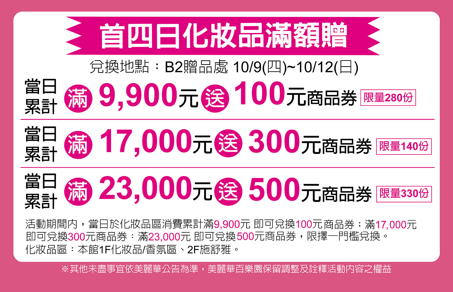 活動期間內,當日於化妝品區消費累計達以下門檻,即可兌換以下贈品,限擇一門檻兌換。