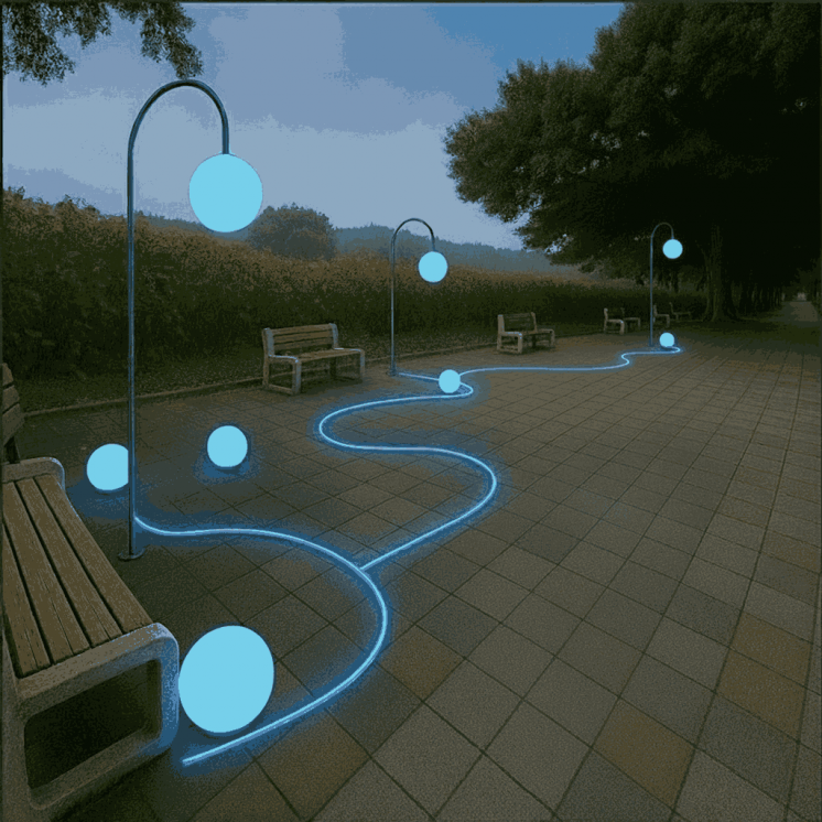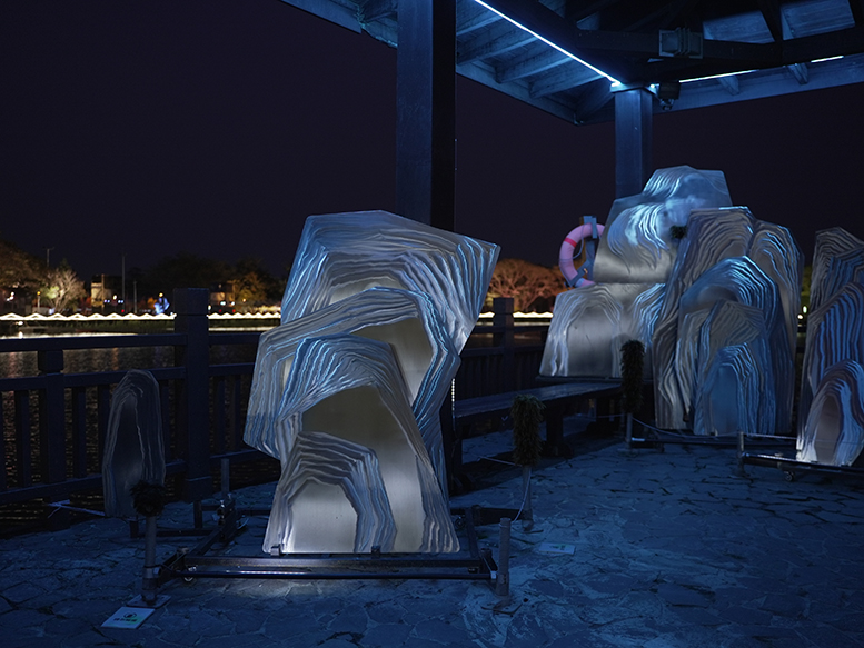 而在台北花博公園圓山園區有一處由球形燈飾與水草組成的特色造景,燈條的光線與周圍的電子聲響將隨著觀眾的進入變化,如同一個富有生命力的場域,在夜裡散發光芒。可以到白晝之夜現場一同參與,成為作品的共創者。