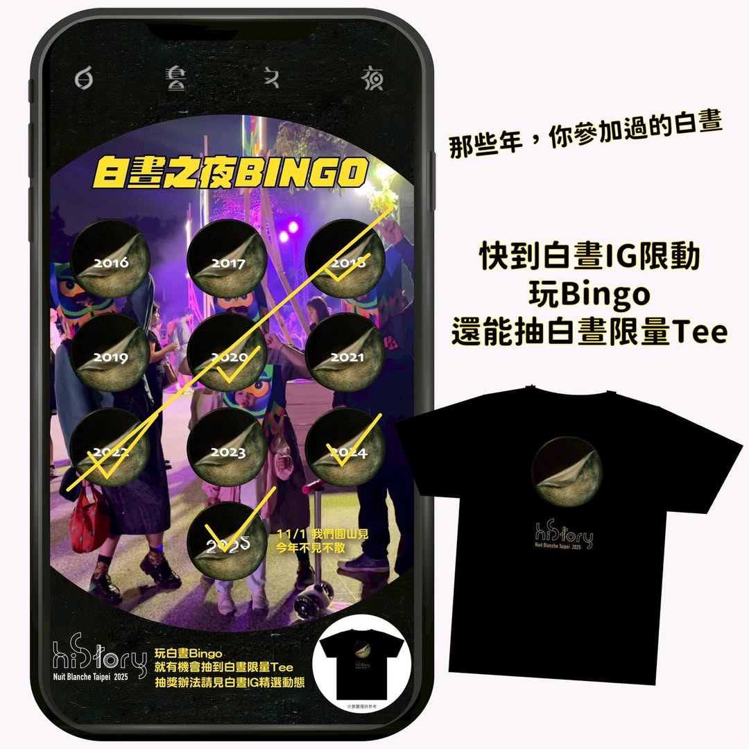 即日起 ~2025/11/2 還有快閃活動 ! 現在到白晝之夜IG找尋BINGO卡,在限動上完成 BINGO 格,公開帳號並 tag @nuitblanchetaipei,經官方轉發即可參加抽獎,有機會獲得白晝之夜限定Tee!