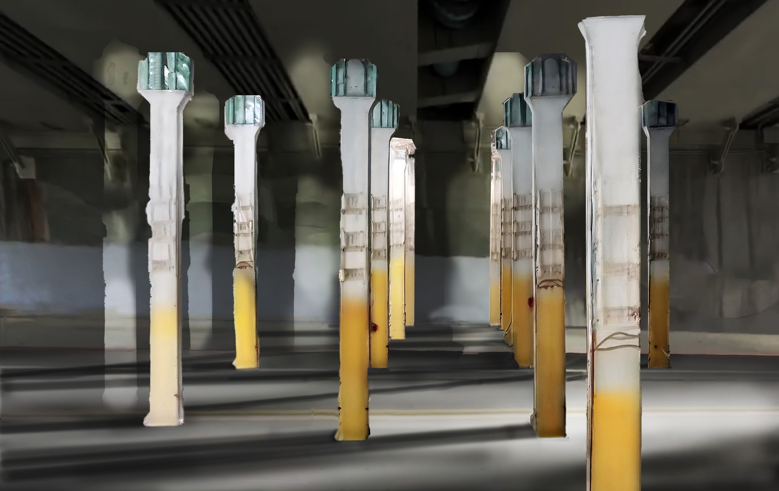 中山橋森林是一件沉浸式裝置藝術,柱體的頂端將不停播放緩慢的吟唱,而一旁光束則穿過透明與半透明薄片,在柱上映照多變光暈,也映照在觀眾身上,充滿詩意又具有戲劇張力的衝突感。