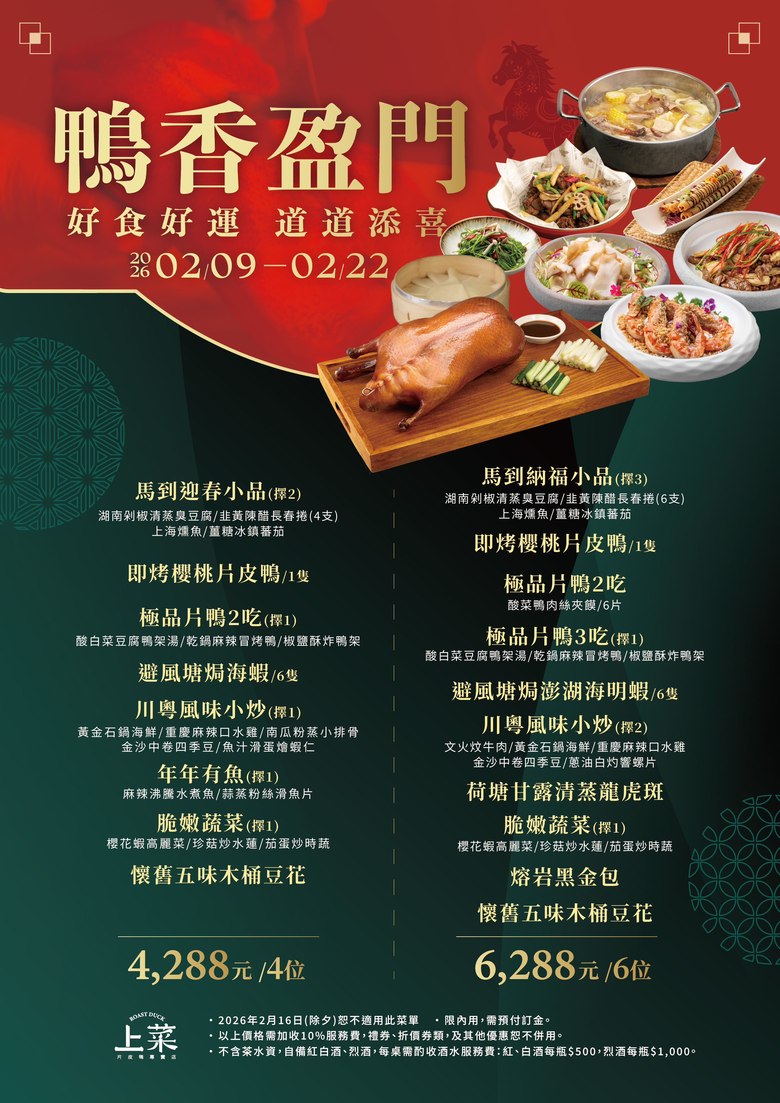 漢來優惠活動 - 《上菜 片皮鴨專賣店》2026鴨香盈門新春宴:2026/02/09-02/22 新春4/6人合菜 好食好運 道道添喜