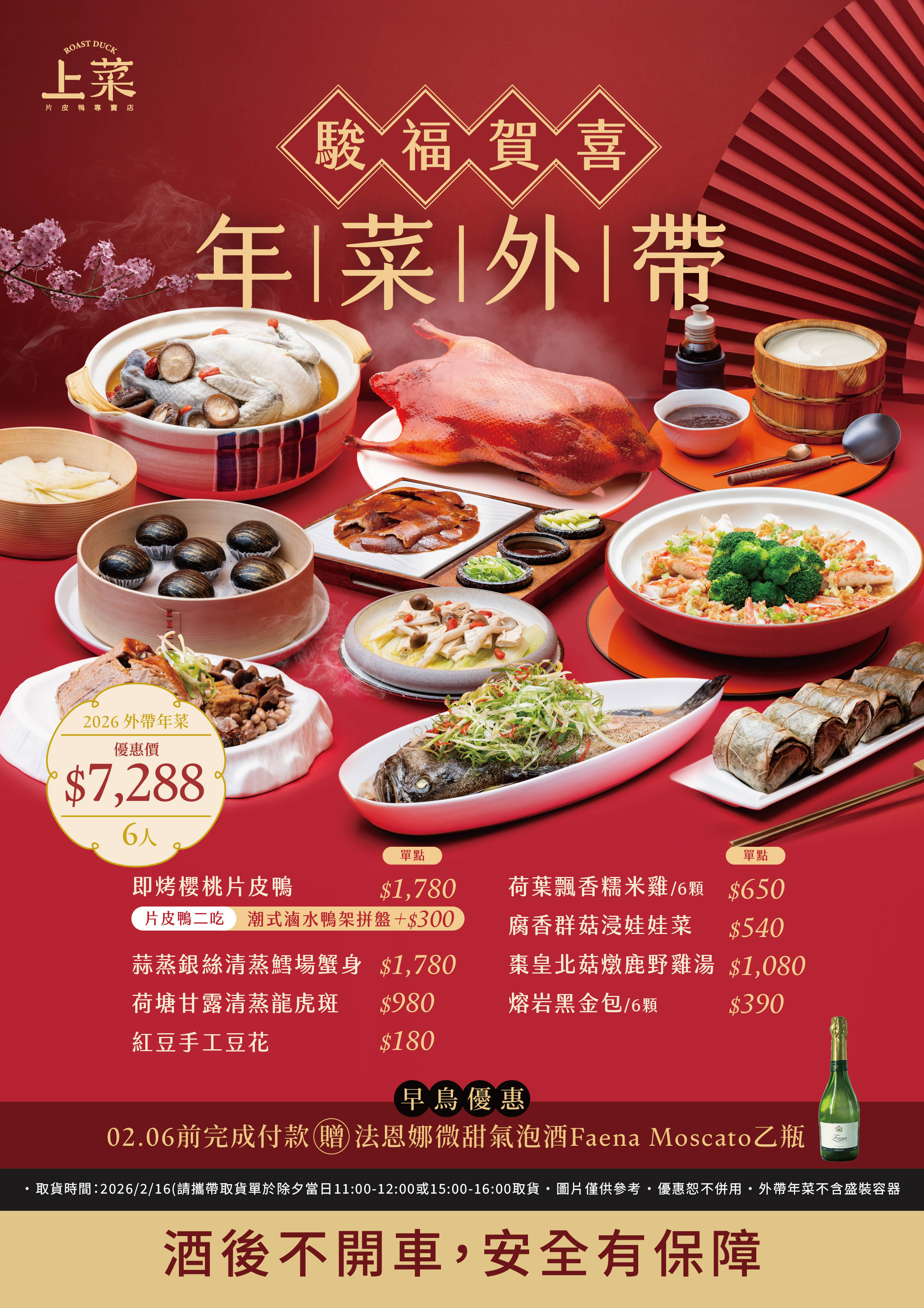 漢來優惠活動 - 《上菜 片皮鴨專賣店》2026駿福賀喜 外帶年菜:2026.02.06前預訂除夕外帶年菜6人桌菜且完成付款,贈「法恩娜微甜氣泡酒」乙瓶
