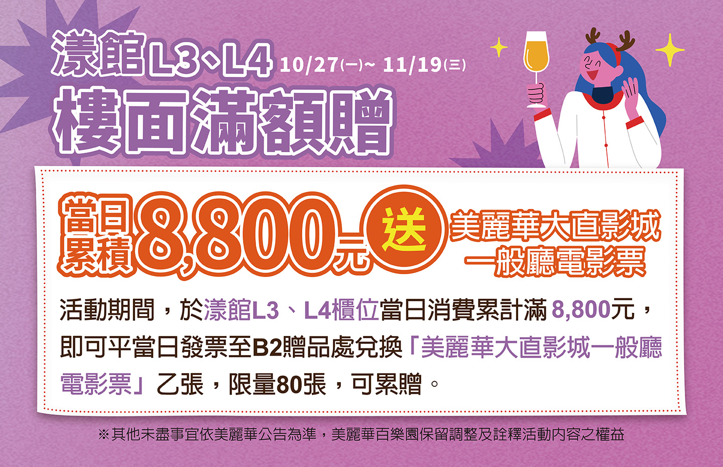 活動期間,於漾館L3、L4櫃位當日消費累積滿8,800元,即可憑當日發票至B2贈品處兌換「美麗華影城電影優惠券」乙張,限量80張,可累贈。