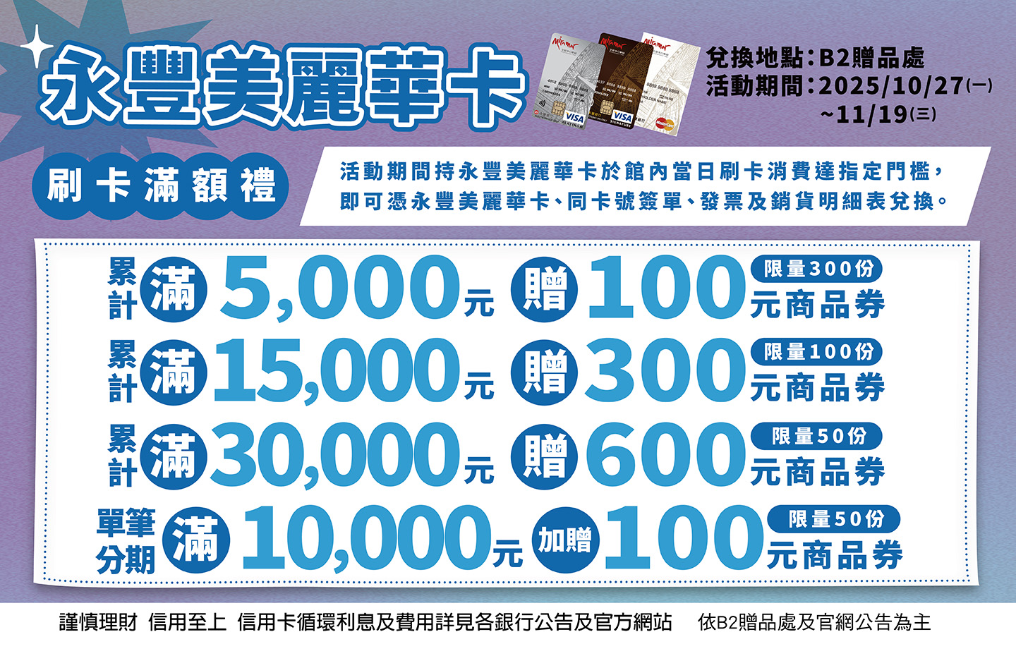 1.限永豐美麗華卡始享優惠,正附卡分開計算,每卡每日限擇一門檻兌換乙份,當日消費金額限當日累計及兌換,恕不跨日合併,餘額恕不累計。數量有限,贈完為止。