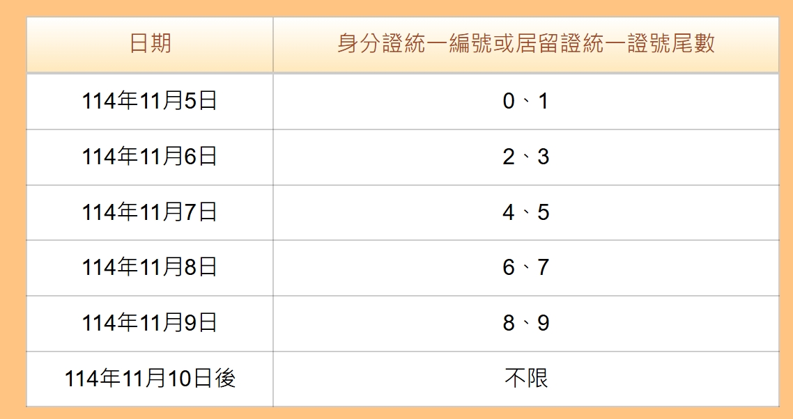 第一天(11/5)普發一萬元登記對象為身分證或居留證為數「0」、「1」者,11/6(四)為尾數「2」、「3」者,11/7(五)為「4」、「5」者,11/8(六)為「6」、「7」者,11/9(日)為「8」、「9」者,11/10(一)不限。
