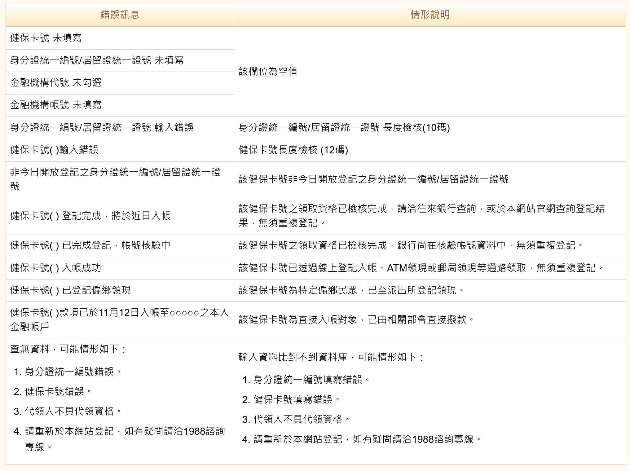若出現「查無資料」,可能是填寫錯誤、代領人不具代領資格或卡號輸錯,只要回到一萬普發網站重新登記即可,其他錯誤訊息說明可見下圖。