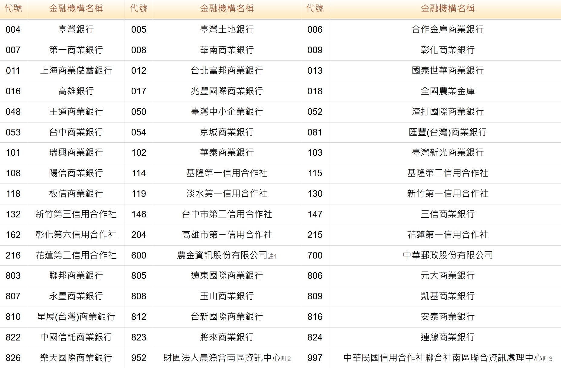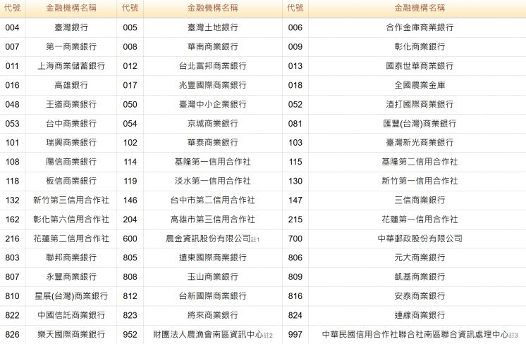 登記入帳適用銀行、郵局、農漁會資訊中心,申請時無須輸入代號,在一萬元網站點選即可。