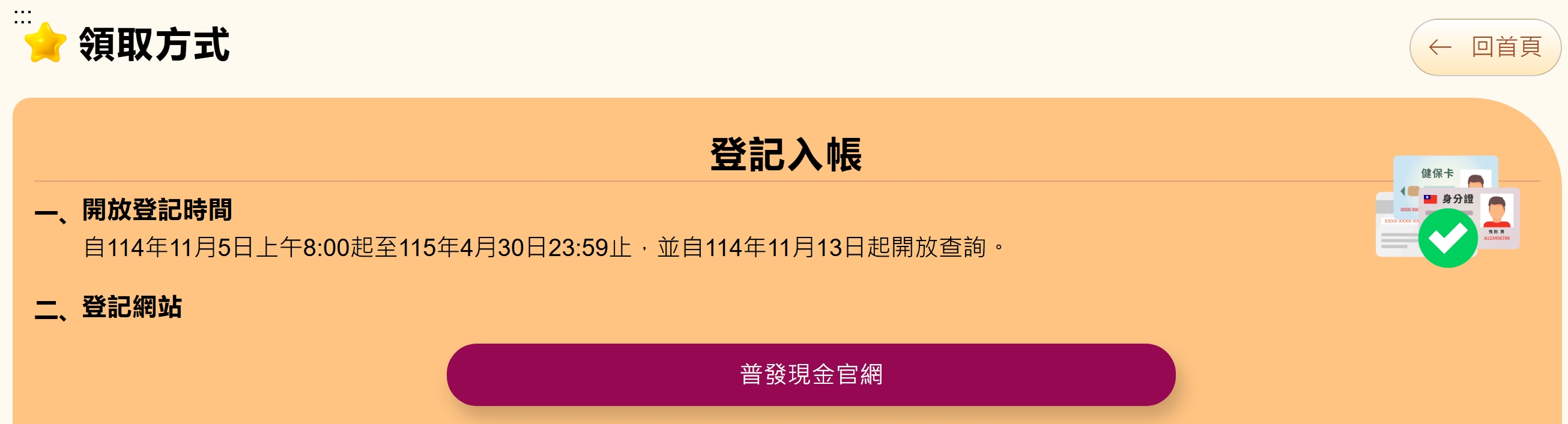 完成上網登記的民眾,自 11/13 起可至「普發一萬元官網(普發現金一萬網站)」,輸入身分證號、健保卡號,查詢登記結果。