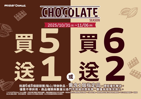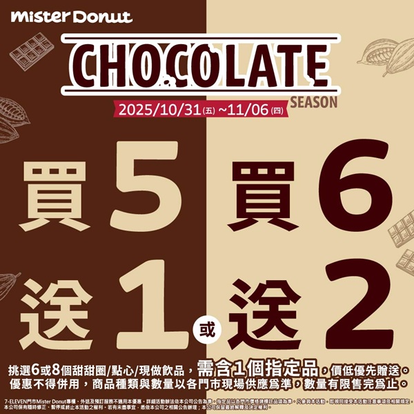 購買指定甜甜圈可享買5送1及買6送2優惠,