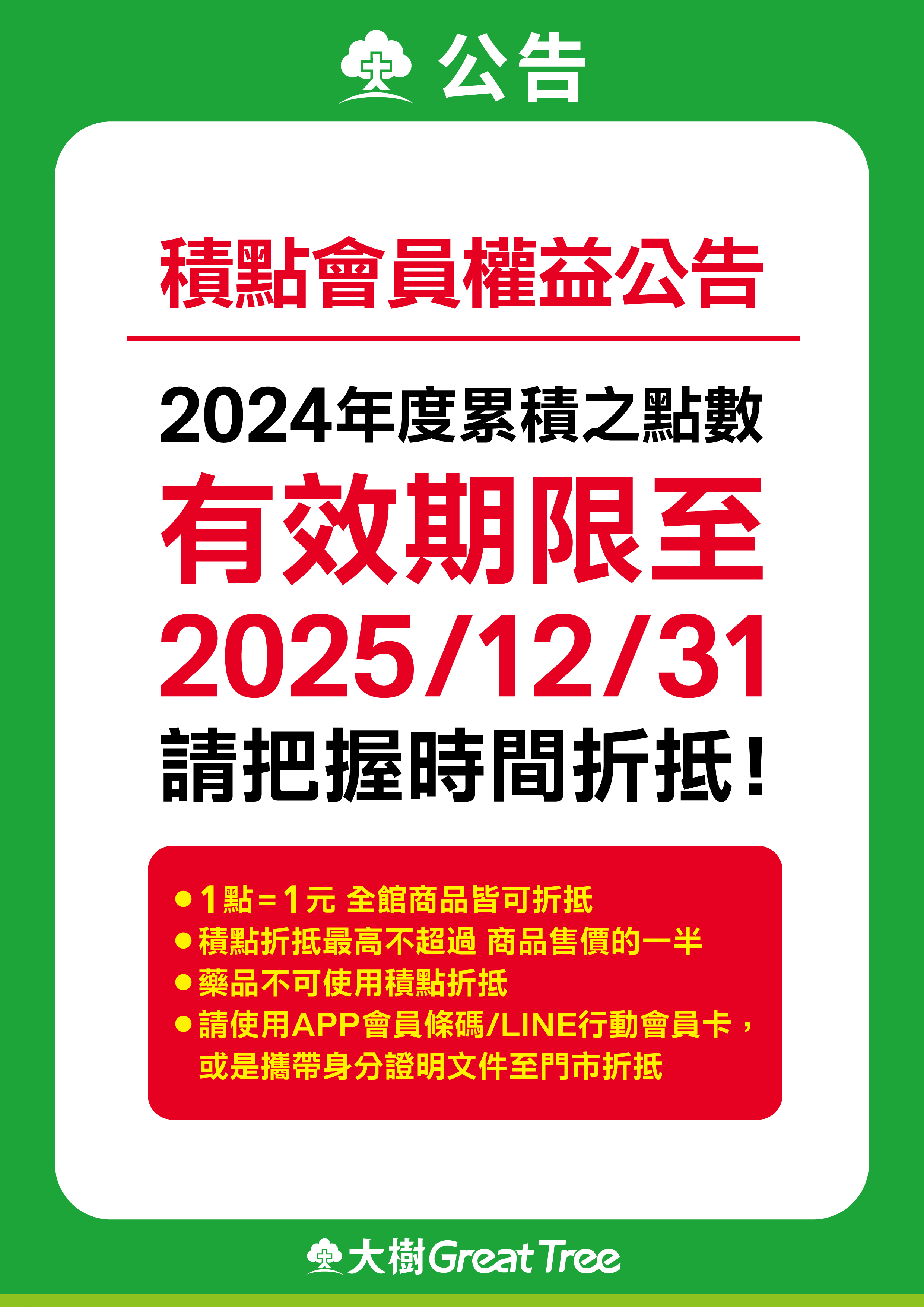 點我觀看大樹藥局優惠活動 - 【積點會員權益公告】2023年度累積之點數即將到期
