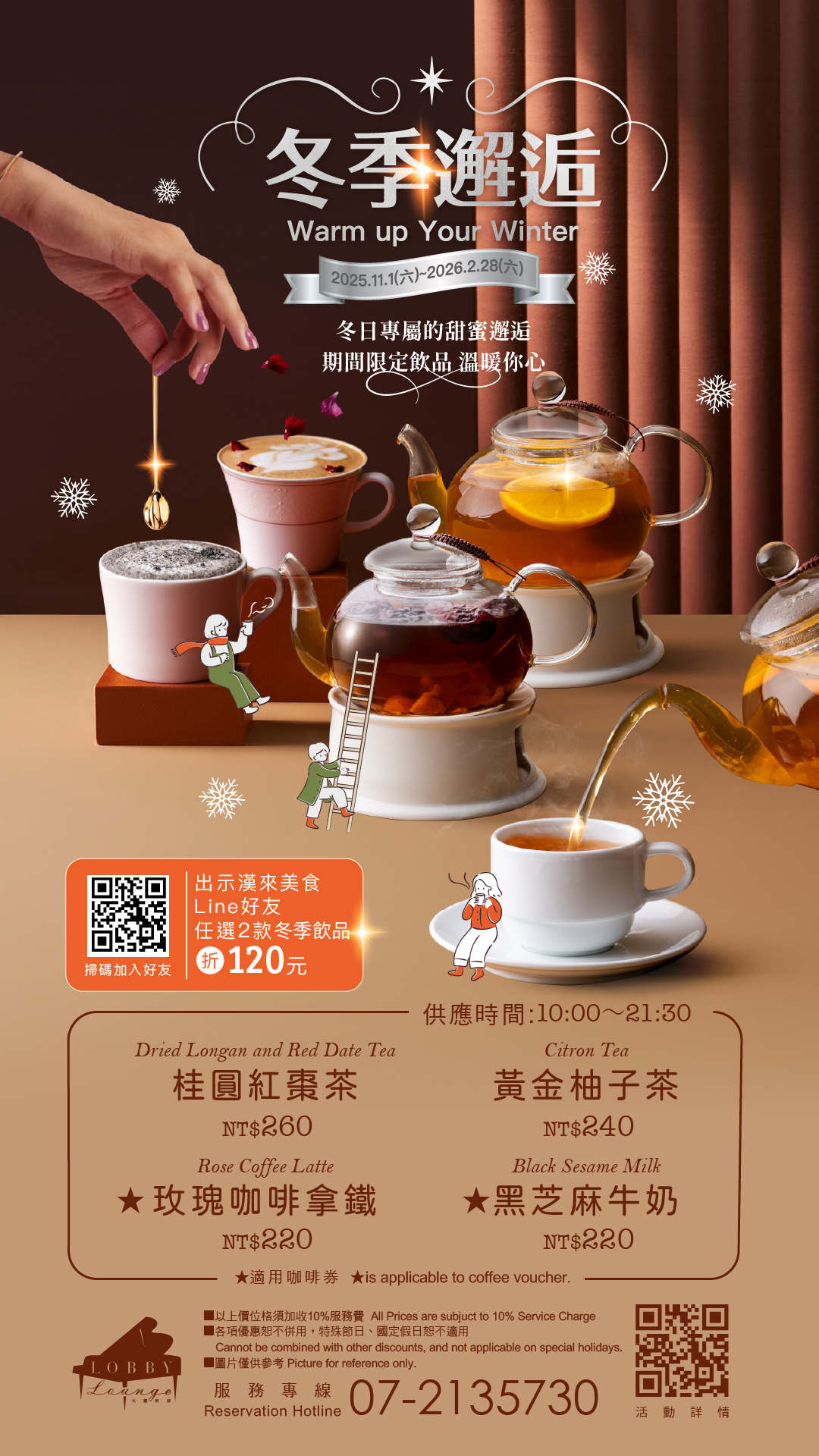 漢來優惠活動 - 《高雄漢來 大廳酒廊》冬日邂逅-冬季限定飲品:2025.11/.1(六)~2026.02.28(六)冬日專屬的甜蜜邂逅,4款期間限定飲品,溫暖你的心!