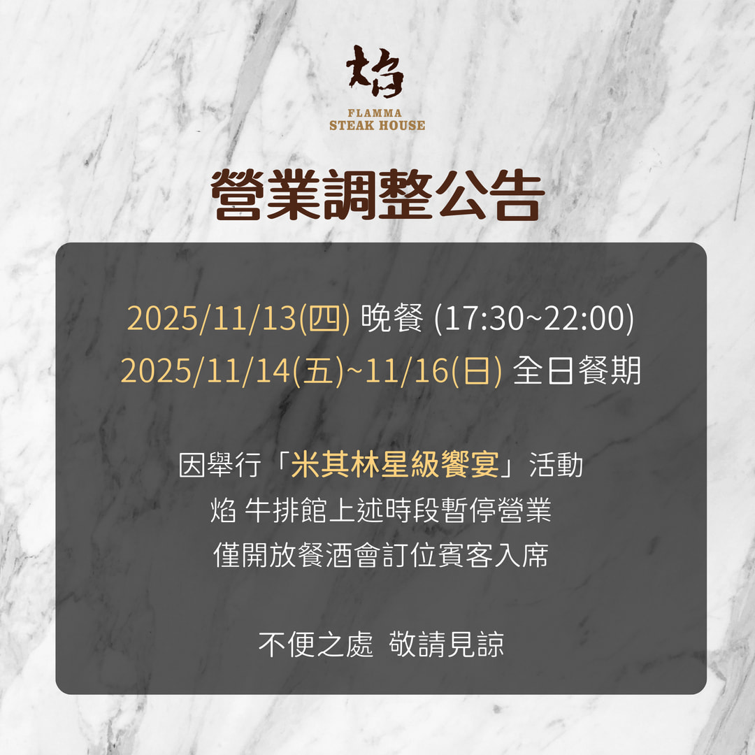 漢來優惠活動 - 《焰 牛排館》2025年11月份營業公告:2025/11/13(四)~11/16(日) 因舉行餐酒會活動,部分餐期暫停營業