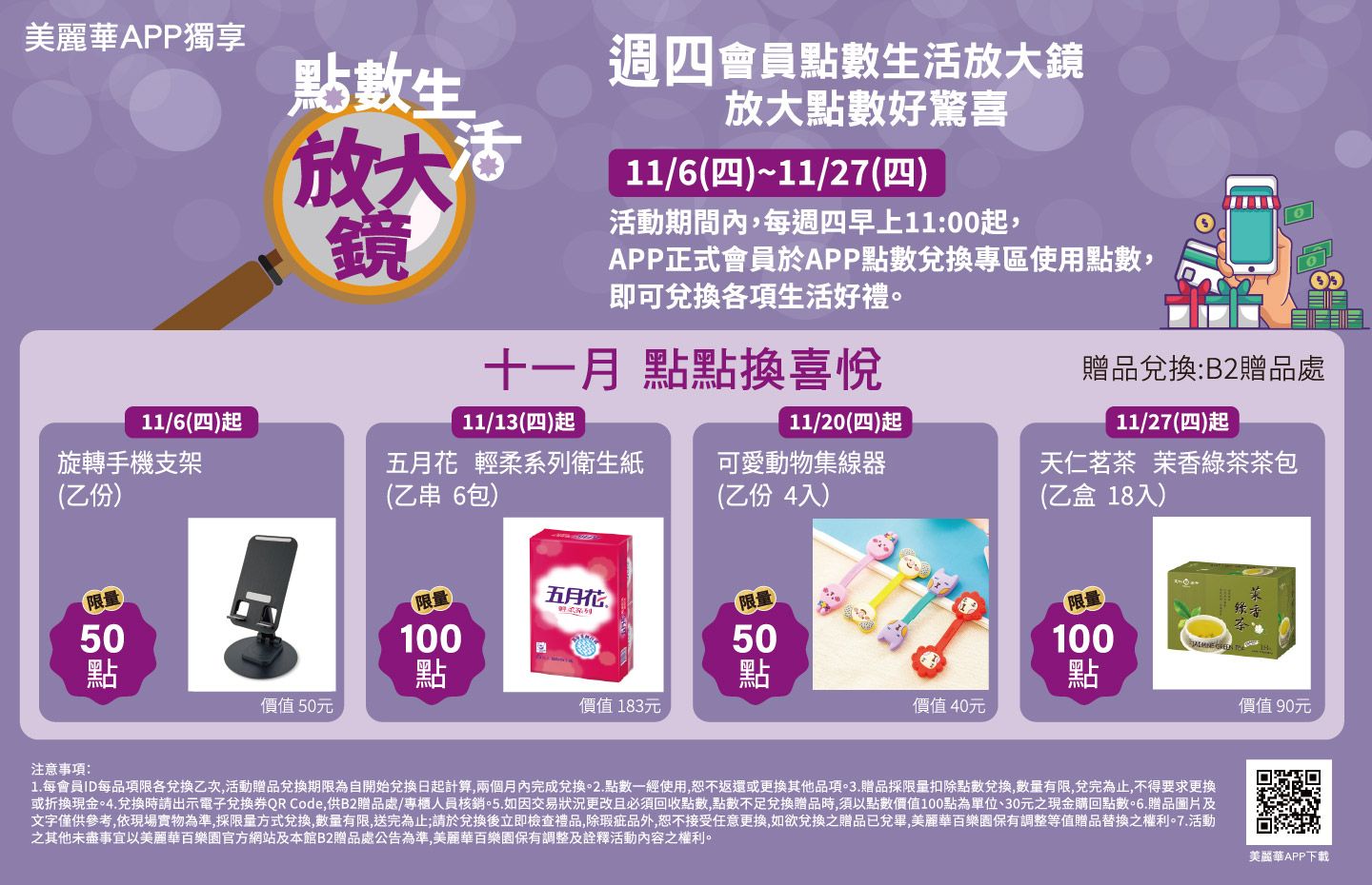 注意事項:1.活動期間每會員ID每品項限各兌換乙次,活動贈品兌換期限為自開始兌換日起計算,兩個月內完成兌換。2.點數一經使用,恕不返還或更換其他品項。3.贈品採限量扣除點數兌換,數量有限,兌完為止,不得要求更換或折換現金。4.兌換時請出示電子兌換券QR Code,供B2贈品處/專櫃人員核銷。5.如因交易狀況更改且必須回收點數,點數不足兌換贈品時,須以點數價值100點為單位、30元之現金購回點數。6.贈品圖片及文字僅供參考,依現場實物為準,採限量方式兌換,數量有限,送完為止;請於兌換後立即檢查禮品,除瑕疵品外,恕不接受任意更換,如欲兌換之贈品已兌畢,美麗華百樂園保有調整等值贈品替換之權利。7.活動之其他未盡事宜以美麗華百樂園官方網站及本館B2贈品處公告為準,美麗華百樂園保有調整及詮釋活動內容之權利。