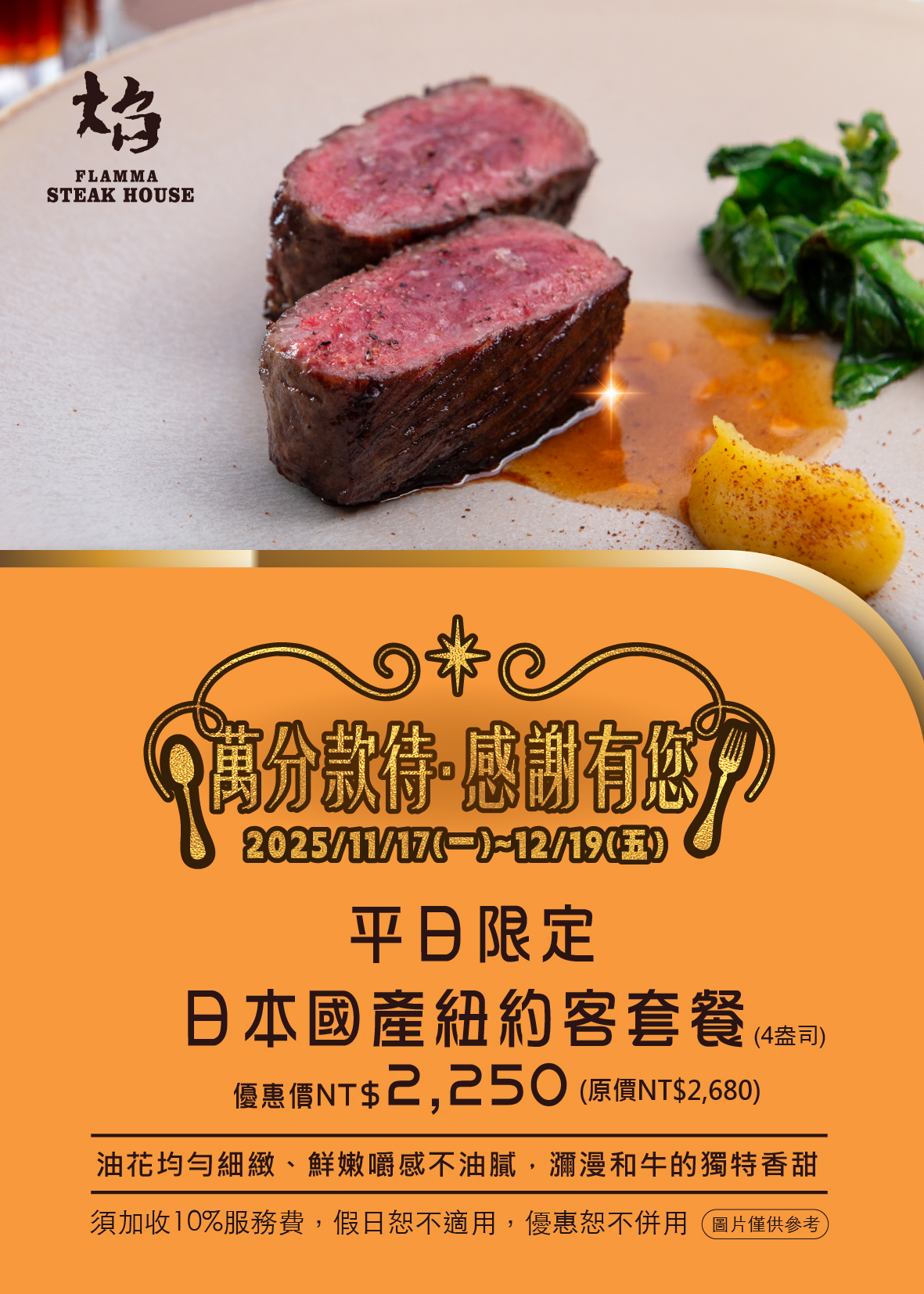 漢來優惠活動 - 《焰 牛排館》萬分款待.感謝有您:11/17~12/19平日限定供應?超值「日本國產紐約客套餐」優惠價$2,250,年末犒賞自己趁就現在!