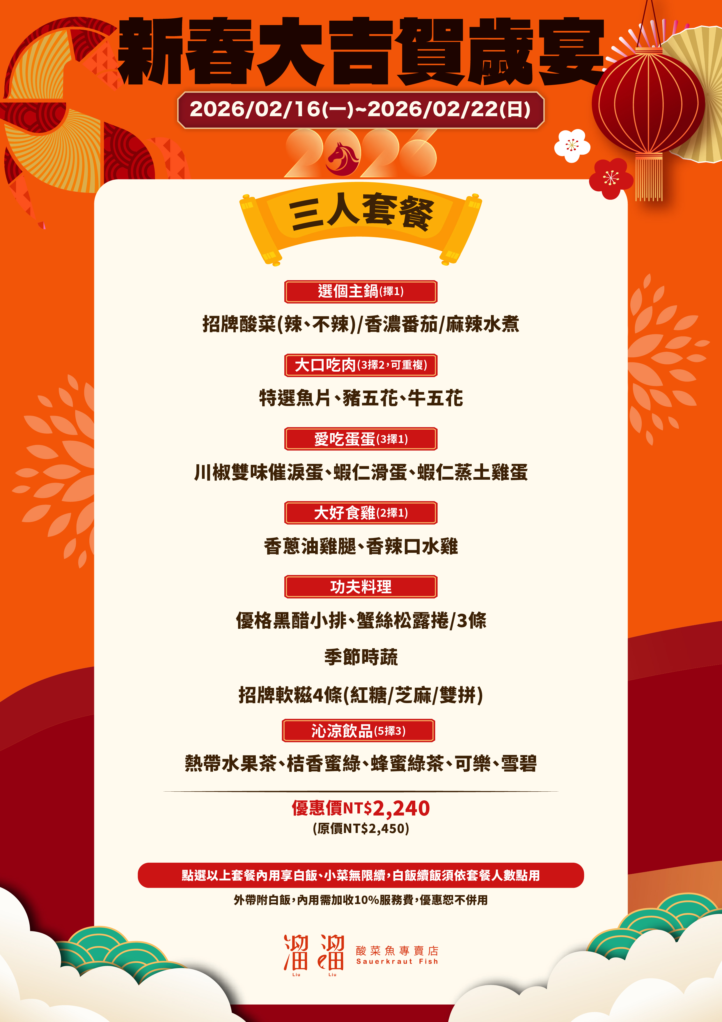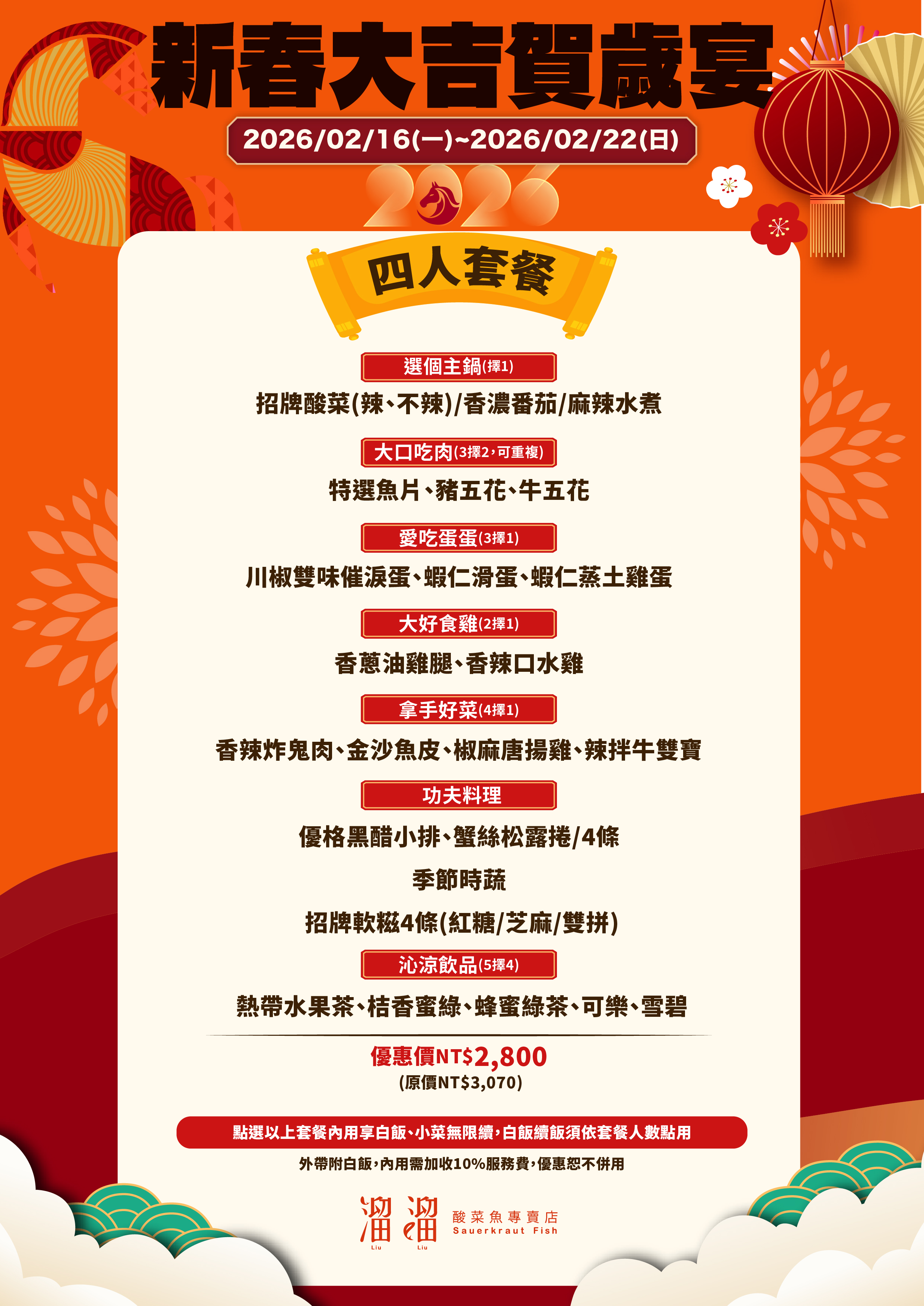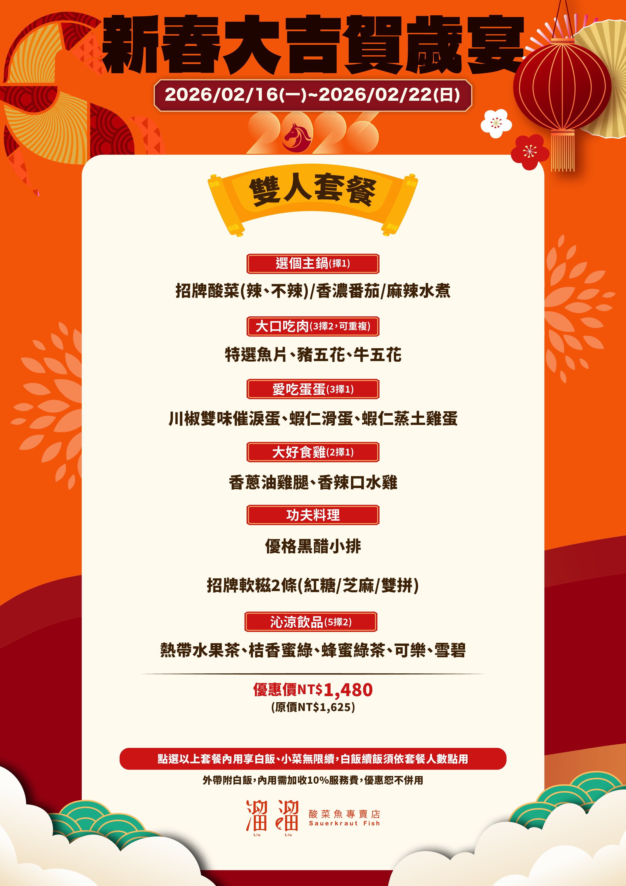漢來優惠活動 - 《溜溜酸菜魚專賣店》新春大吉賀歲宴:?2026/2/16(一)~2/22(日) 推出 #春節限定特別套餐,雙人、三人、四人多種組合任你選?