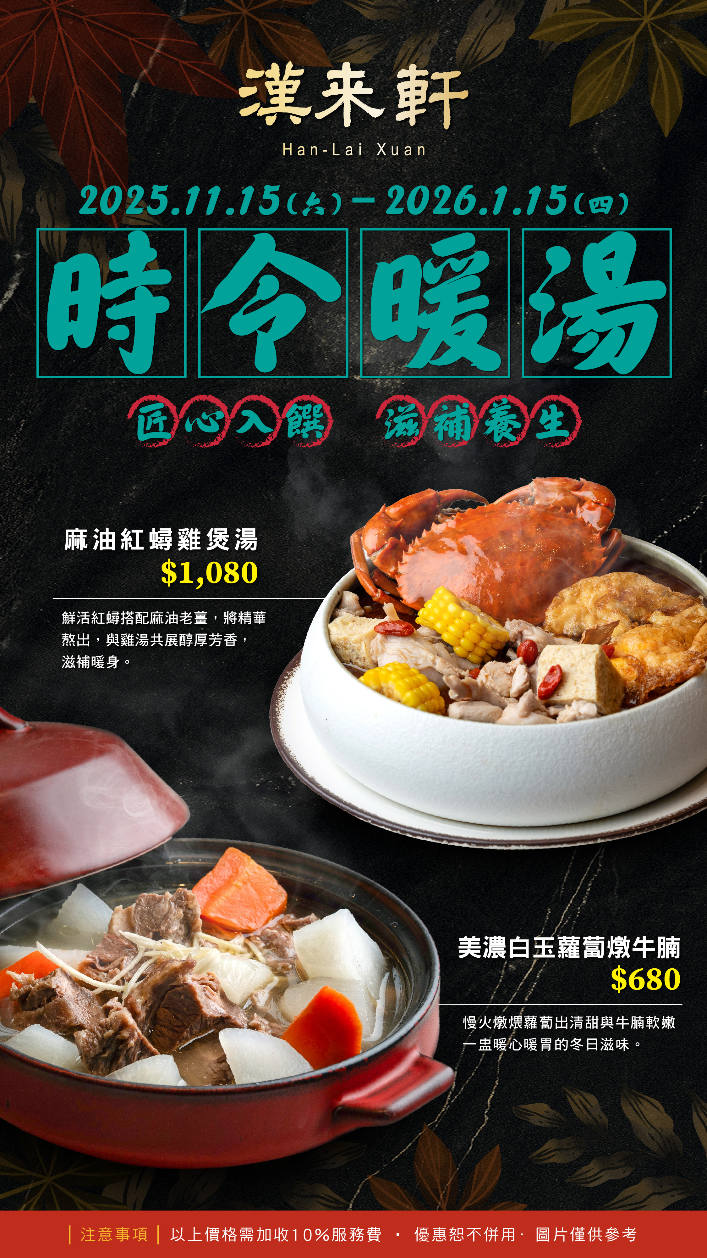 點我觀看漢來優惠活動 - 《漢來軒》時令暖湯:秋冬寒意漸濃,11/15~115/1/15 漢來軒推出兩道溫暖湯品以匠心入饌,溫潤身心,滋補養生。