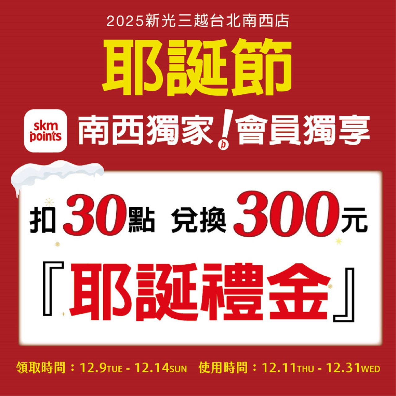 【注意事項】(1)12/9至新光三越APP上領取,會員點數一經扣除,恕不返還。(2)電子抵用金為無償取得性質,使用時恕不找零亦不得折換現金。(3)全館單筆滿3,000可折抵300元(小米/黃金/菸酒/CASETiFY/POP MART/UQ/餐廳/小吃/咖啡廳/超市除外);名品/大家電/法雅客/istore消費單筆滿6,000可折抵300元,每次折抵金額以300元單位,單筆折抵上限為該會員可兌換之最高份額。(4)電子抵用金使用期限自2025年12月11日至2025年12月31日止,逾期恕不受理。(5)電子抵用金限台北南西店使用(6)其他末盡事宜以店内公告為主。