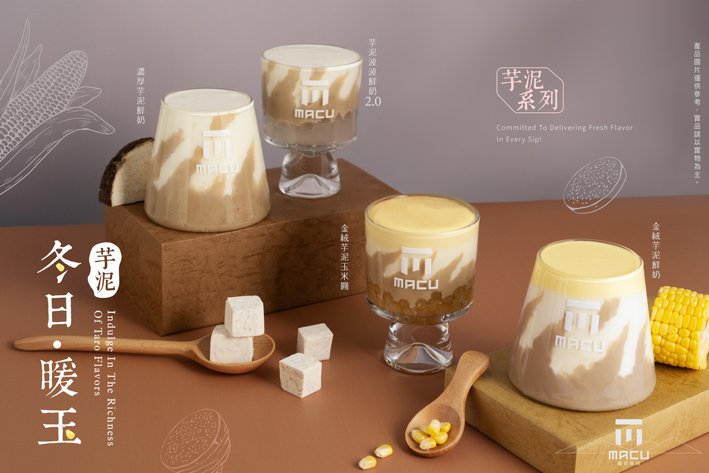 麻古茶坊於 12/10 推出全新「金絨芋泥」飲品,同步迎回人氣經典「濃厚芋泥鮮奶」與「芋泥波波鮮奶2.0」。全新金絨系列結合大甲芋頭搭配獨創玉米風味的金絨芝芝,打造今冬最具話題的芋香新風味。
