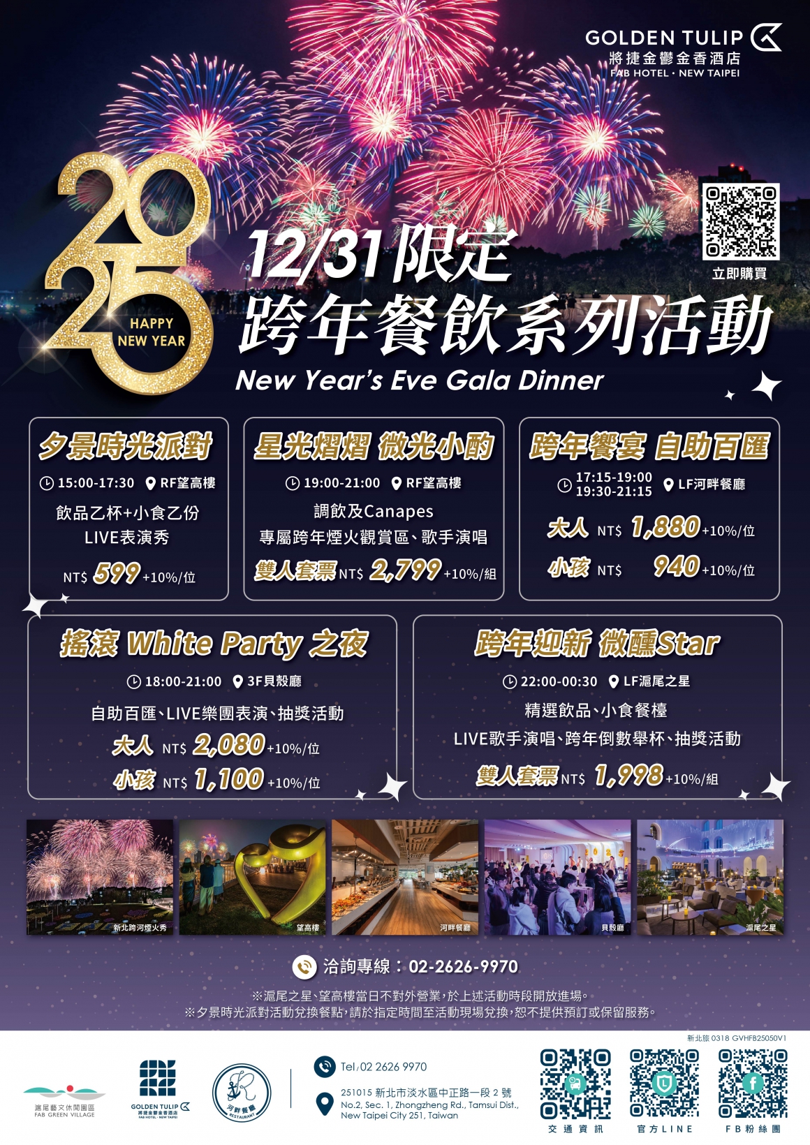 12/31 飯店餐廳也有推出自助式下午茶、百匯晚餐等跨年大餐 ! 不只用餐期間有表演可以欣賞,飯店亦提供專屬觀賞平台,讓大家看跨年煙火,最低每人只要 1,408 元。特別是住在淡水的鄉親或在大淡水地區念書的大專院校學生,元旦享 8 折優惠,符合資格的民眾別錯過。?查看價位及訂位專線