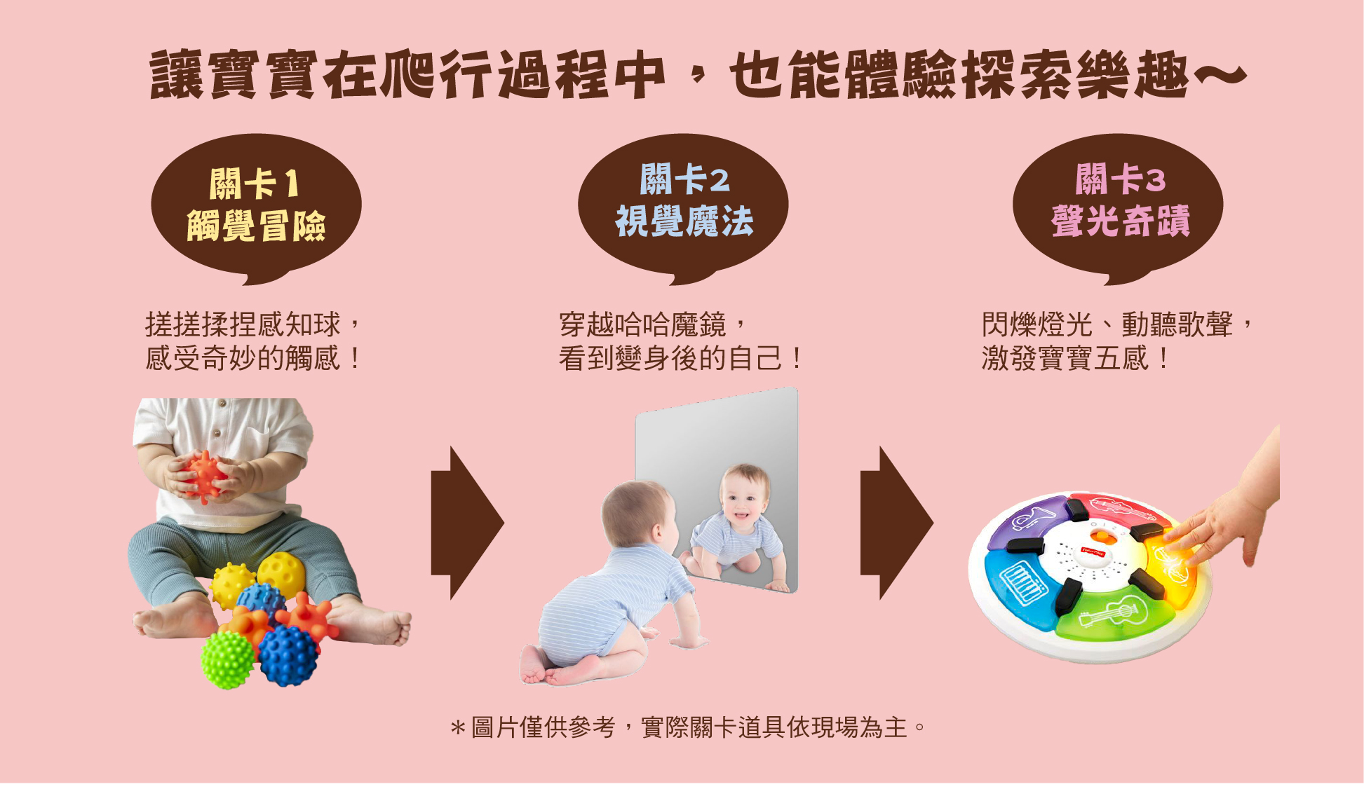 快來打扮成糖果、甜點等可愛角色,一邊爬行、一邊闖過有趣的「感官探索關卡」,朝著夢幻終點前進吧!
