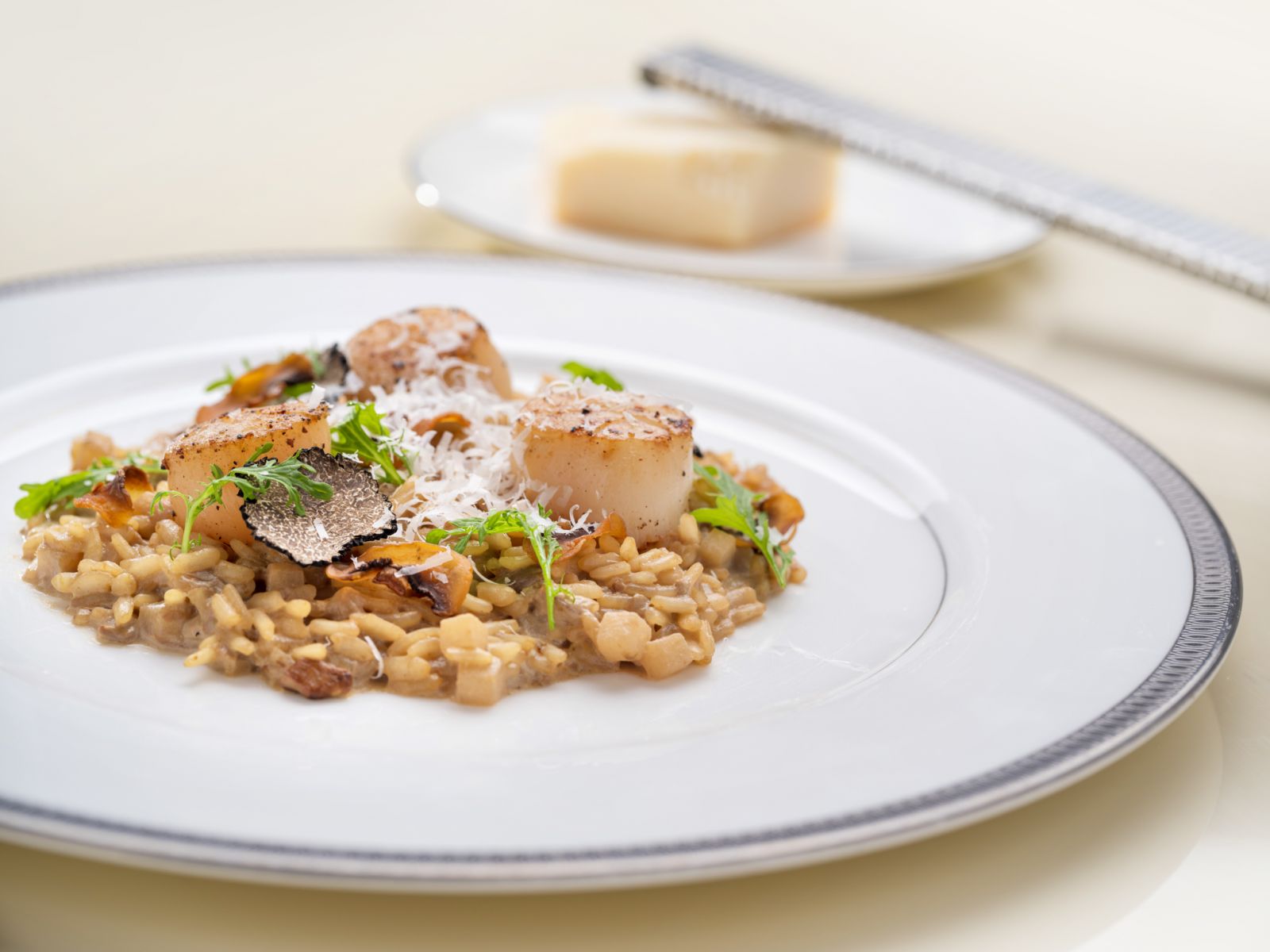 「北海道干貝松露野菇燉飯」每位1,580元+10%,復刻傳統義式燉飯的經典風味,主廚將義大利米以牛肝菌高湯及馬斯卡彭起司燉煮至綿柔細膩,添以豆薯丁增加爽脆口感,綴以松露片以及鮮甜干貝,展演暖冬的豐盈雅緻香氣。