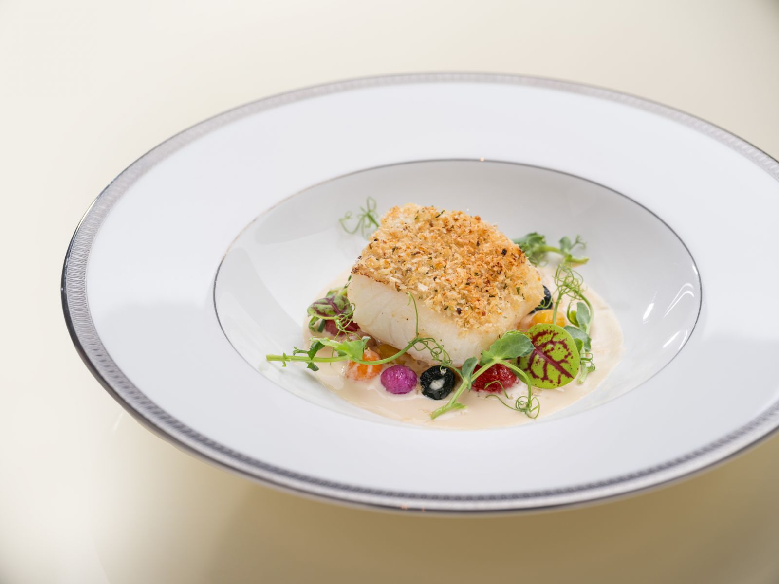 「爐烤波爾多式圓鱈佐白酒檸檬醬汁」每位1,880元+10%,將圓鱈以香料輕醃舒肥後,主廚發揮巧思,以法式經典波爾多烹調技法,於圓鱈外層撒上麵包粉及香草後以爐火烘烤,造就外層金黃酥脆而內裡鮮嫩多汁,佐以白酒檸檬醬汁的清亮酸香亦與魚肉的純粹細膩相得益彰。