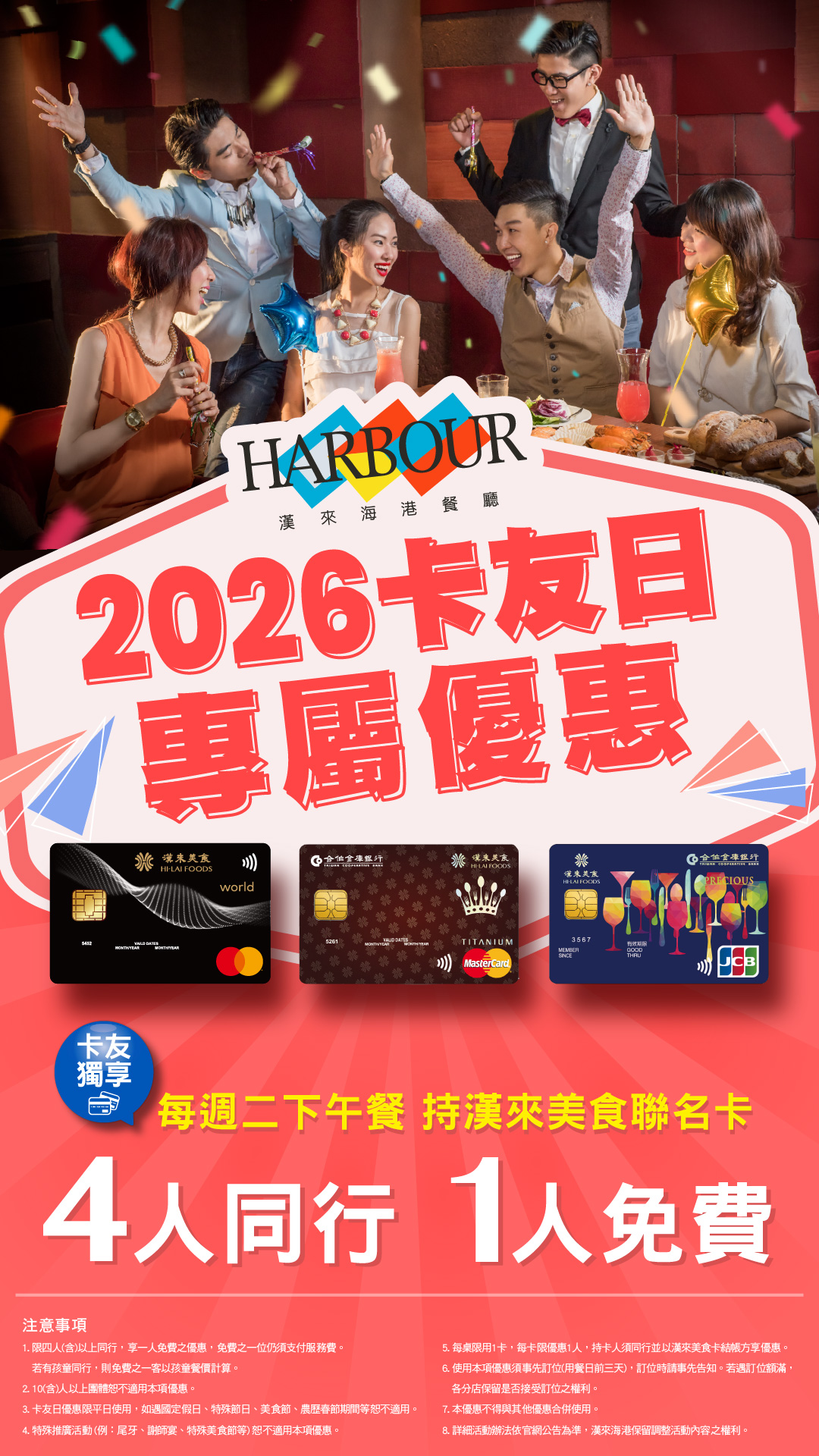 點我觀看漢來優惠活動 - 《漢來海港》漢來美食聯名卡4人同行1人免費(週二下午餐):2026漢來美食聯名卡專屬優惠