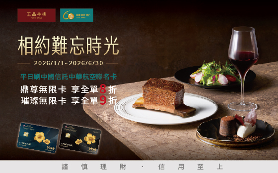 3. 本優惠限刷中國信託中華航空鼎尊無限卡/璀璨無限卡。每卡每日限享本優惠乙次,全單折扣優惠是依消費定價計算,另收定價10%服務費。