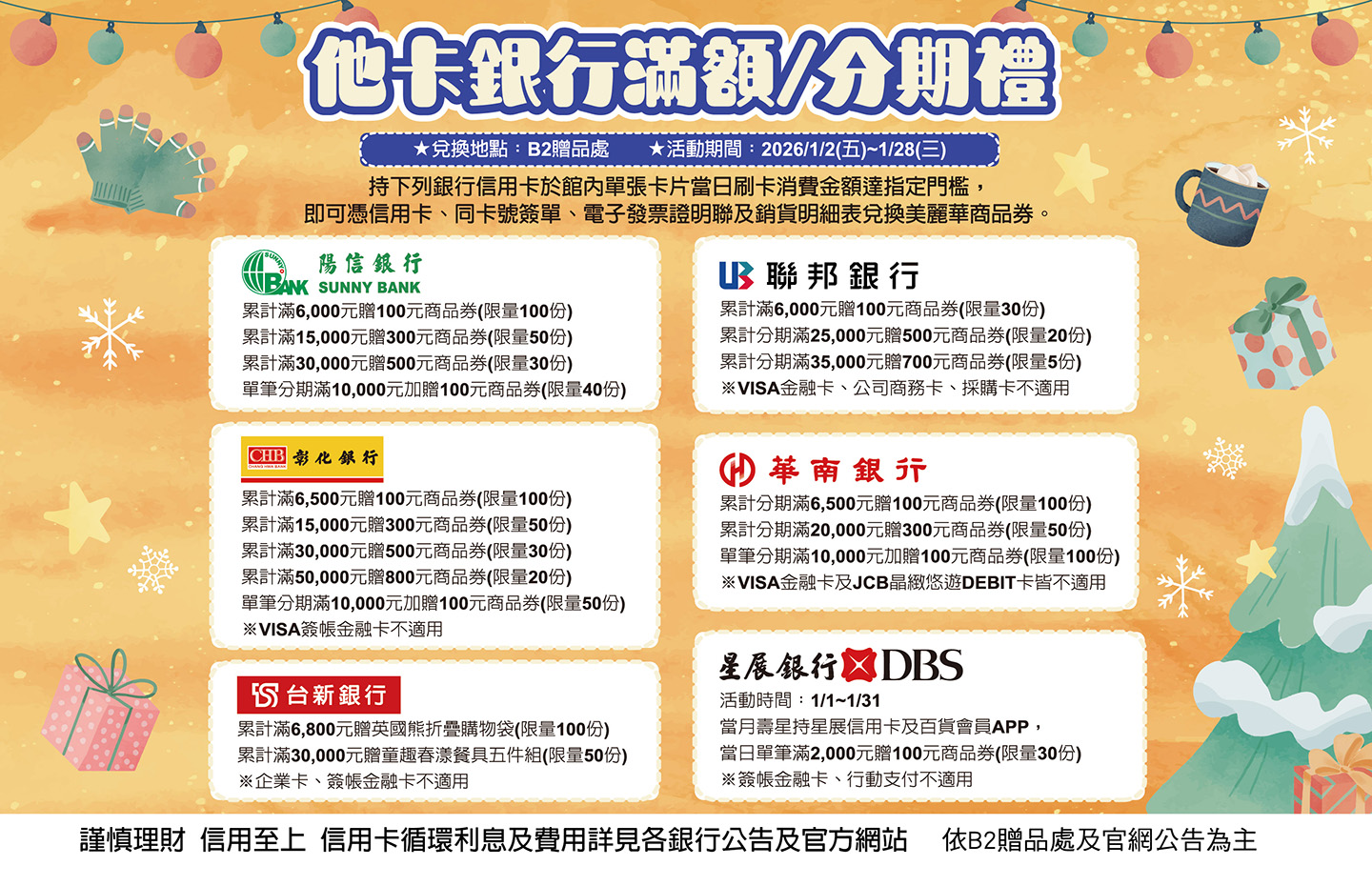 1.僅限台灣發行之信用卡兌換,正附卡分開計算,各門檻滿額/分期禮每卡每日限擇一門檻兌換乙份,簽單餘額恕不累計,兌換贈品時請同時攜帶信用卡、同卡號簽單、電子發票證明聯及銷貨明細表。2. 使用Line Pay、街口支付、Pi拍錢包、橘子支付、悠遊付、全支付、icash Pay、全盈Pay、Miramar Pay消費同享刷卡滿額禮兌換資格,兌換需攜帶實體卡片、同卡號簽單、電子發票、銷貨明細表並出示消費紀錄之頁面,其餘行動支付皆不列入計算;使用Line Point、街口幣、P幣、橘子零用金、悠遊付、全支付全點、OPENPOINT、全家Fa點、美麗華APP點數折抵之消費金額不列入計算。3. 美麗華大直影城、摩天輪、湯姆熊、各樓層餐廳/喫茶店/咖啡廳、B2卡氏汽車美容、B1 Mia C’bon、B1美食街等部分櫃位不適用此優惠。4.未特別註明之銀行,分期同享滿額禮,贈品數量有限,贈完為止,美麗華商品券使用限制及不適用櫃位請參照券面訊息。5.贈品如有變更恕不另行通知,以現場實物及B2贈品處公告為準,簽單金額依紅利折抵後計算,餘額恕不累計。6.兌換滿額/分期禮不適用之卡種請洽各銀行客服專線。7.星展銀行壽星滿額禮,限百貨會員(壽星本人)現場兌換,不可代領。需提供身分證明文件供兌換人員核對生日等必要資訊,無法配合者,恕不回饋贈品。8.各銀行保留變更活動之權利,詳細公告以各銀行網站及美麗華百樂園現場公告為準。