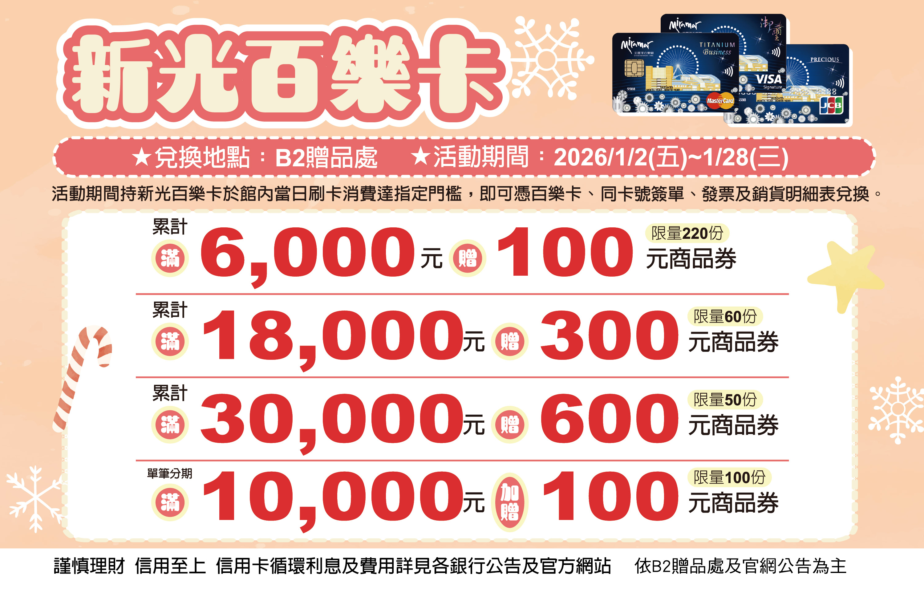 活動期間持新光百樂卡於館內當日刷卡消費達指定門檻,即可憑百樂卡、同卡號簽單、發票及銷貨明細表兌換。
