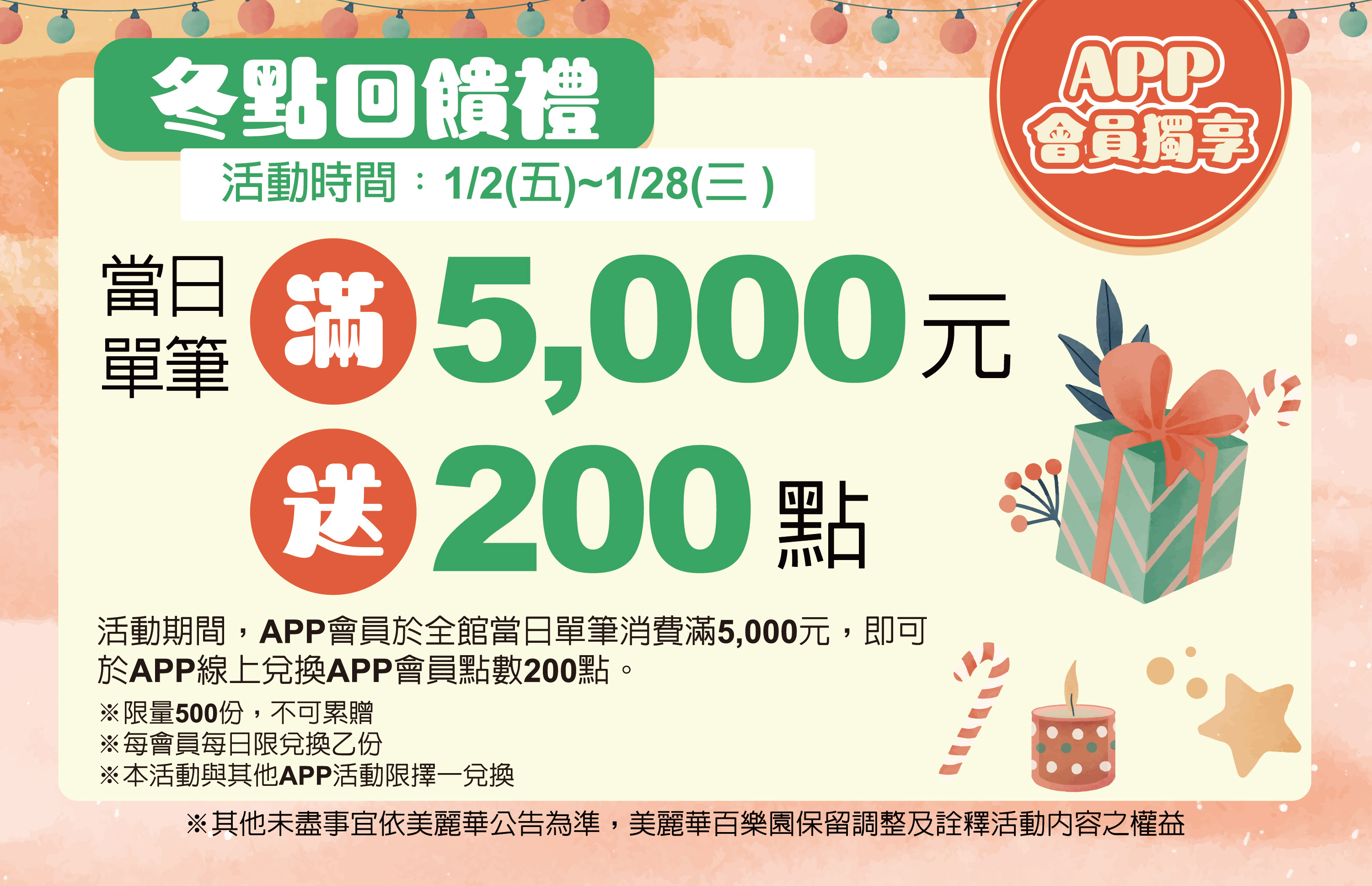 活動期間,APP會員於全館當日單筆消費滿5,000元,即可於APP線上兌換APP會員點數200點。