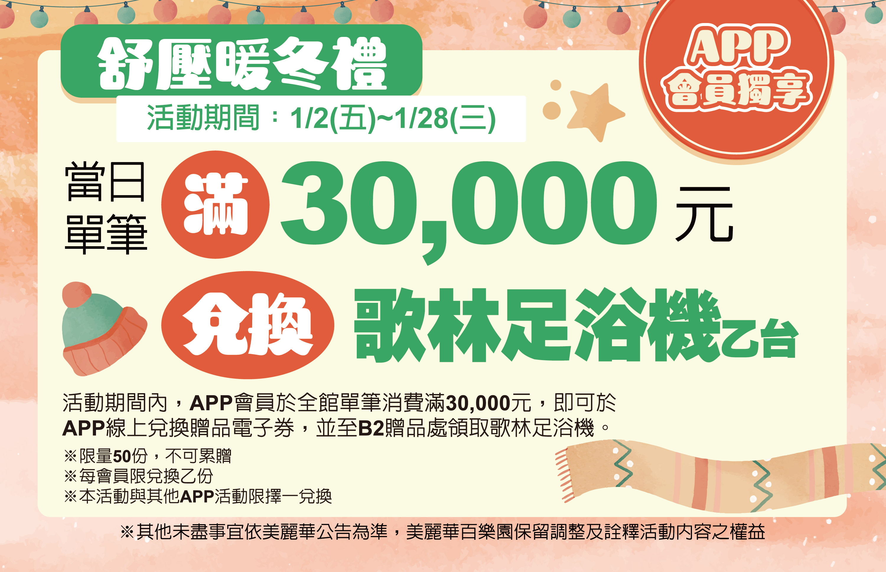 活動內容:活動期間內,APP會員於全館單筆消費滿30,000元,即可於APP線上兌換贈品電子券,並至B2贈品處領取歌林 足浴機。