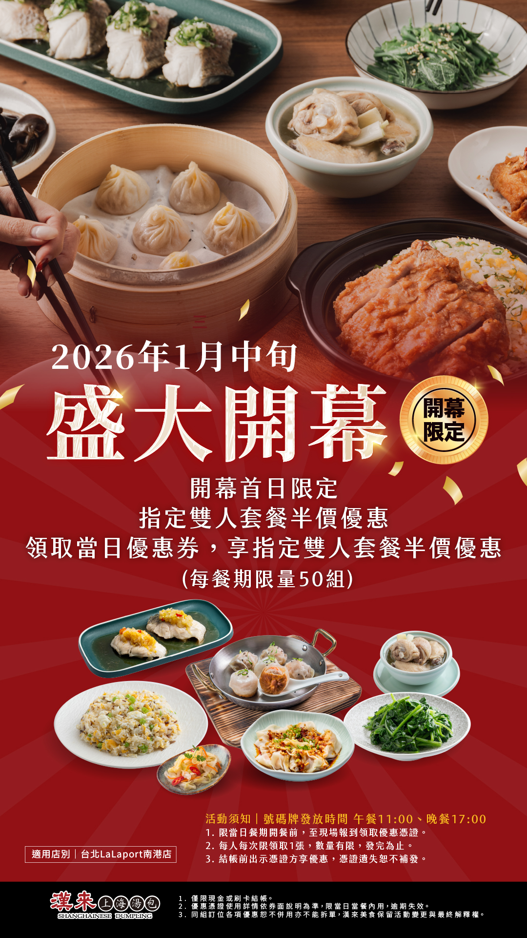 漢來優惠活動 - 《漢來上海湯包》台北LaLaport南港店 盛大開幕:2026/1/16 台北LaLaport南港店 盛大開幕慶,限定活動邀您共慶!