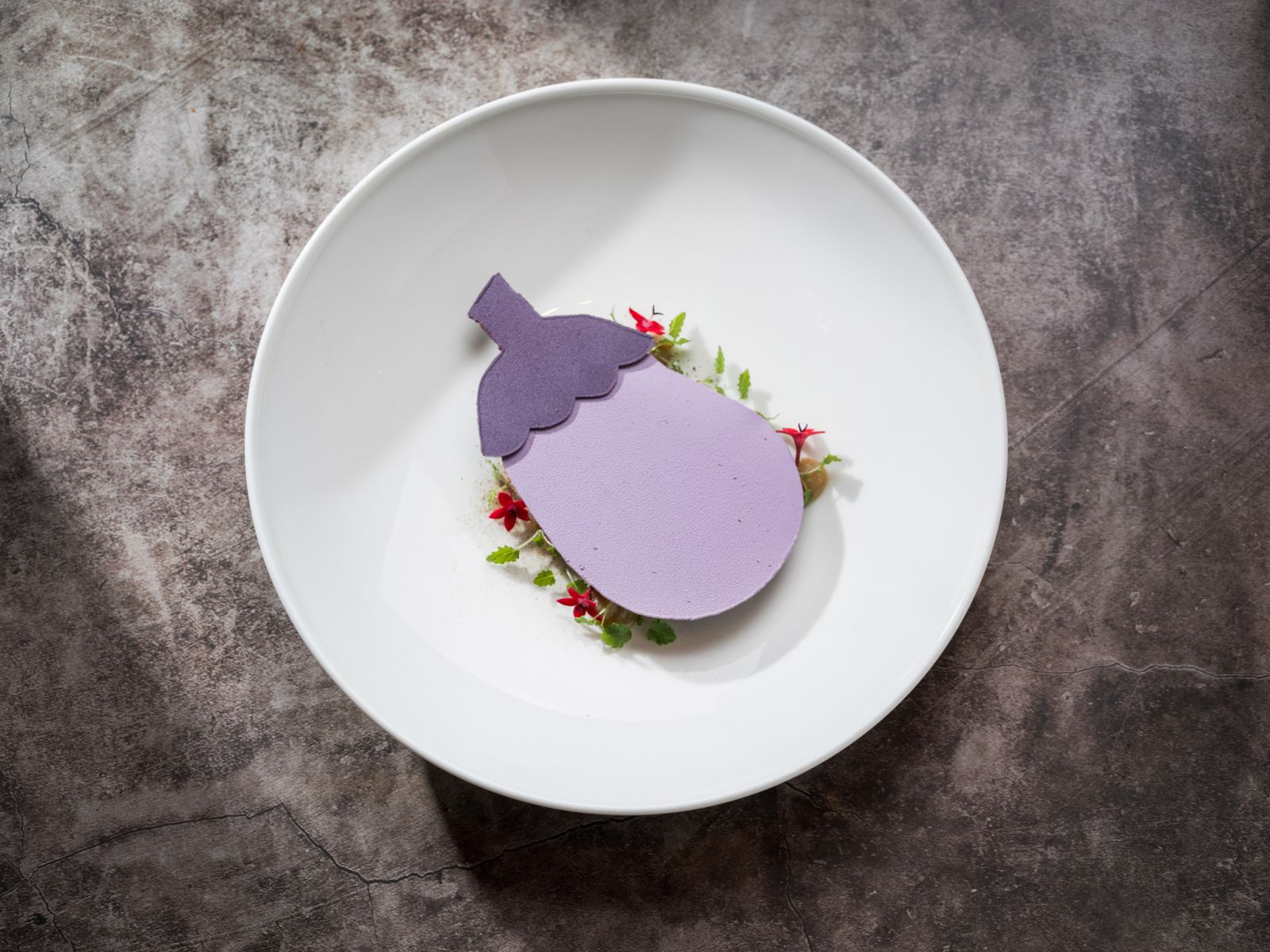 此道甜品的特別之處亦為運用了茄子的不同部分以呈現多樣的質地層次。有別於傳統以茄子與內餡層疊交織及多次油炸的千層派作法,主廚玩轉經典以更為精緻且清爽的手法詮釋:取茄子皮以熱烤烘乾至焦脆化並細磨成粉帶出清雅香氣。再以麵粉、可可與奶油為基底,揉合烘烤後松子與茄子粉,製成質地濕潤、層次細緻的松子酥餅碎。柔軟的茄子果肉則切小方塊,以糖、肉桂、橙皮等特製糖水反覆澆淋而成糖漬茄子丁、於鍋中以糖、鮮奶油、奶油、海鹽一同拌炒而成海鹽焦糖茄子。盛裝時主廚先鋪上巧克力慕斯與茄子泥襯底,於上優雅錯落著糖漬茄子丁及海鹽焦糖茄子,並綴上茄子粉、松子碎及掛霜松子添以一抹堅果芬芳,於盤中打造一座精緻迷你的蔬香果園,宛若暖風輕拂綻放著盎然的生命力,於上輕柔覆以主廚巧製茄子巧克力片,食用時以湯匙輕敲打碎搭配一同入口,細膩綿軟的香甜帶著爽脆口感,以多款手法所詮釋的茄子多樣面貌,於口中交織出和諧而繽紛的感官驚喜!主廚亦暱稱此道甜品為「No Waste Dessert」,以細膩巧思為傳統風味賦予當代食藝的精彩詮釋。
