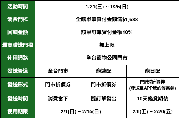 會員當日消費扣除適用折扣優惠券並排除特殊優惠商品,商品結帳實付金額滿 1,688元(含)以上,即可獲贈「現金折價券」。分批取、美容、住宿、水手兩棲爬蟲異寵櫃位、水族星球櫃位、魚部落專櫃恕不參與本優惠活動。折價券面額依「商品結帳實付金額 × 10%」計算,小數點後採四捨五入,面額無上限。折價券將於結帳後由收銀櫃台直接列印發放。門市及寵速配現金折價券需於 2026年2月1日至2026年2月15日期間使用,寵日配折價券需於 2026年2月6日至2026年2月20日期間使用,逾期無效。折價券無消費金額限制,且折抵金額無上限。現金折價券限寵物公園會員本人使用,不可轉讓或贈送他人。門市/寵速配折價券為實體票券(寵日配為 APP 優惠券),塗改、影印或以任何形式複製皆屬無效。折價券如有破損無法辨識、遺失或逾期,恕不補發。使用折價券折抵時,需於結帳前出示實體票券,截圖或翻拍無效。折抵後,折價券將由櫃檯人員收回。每張折價券需一次性使用完畢,不可重複使用、不找零、亦不可儲值且不與任何優惠同時併用。辦理退貨時,需一併退回現金折價券,否則恕不接受退貨。折價券全品項皆可折抵但不適用於美容服務、住宿服務、藥品、水手兩棲爬蟲異寵櫃位、水族星球櫃位及魚部落專櫃。萬達寵物保留修改、變更、暫停或終止本活動內容之權利,恕不另行通知。
