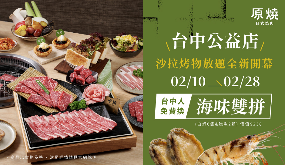 原燒優惠活動:台中公益|沙拉烤物放題新開幕
