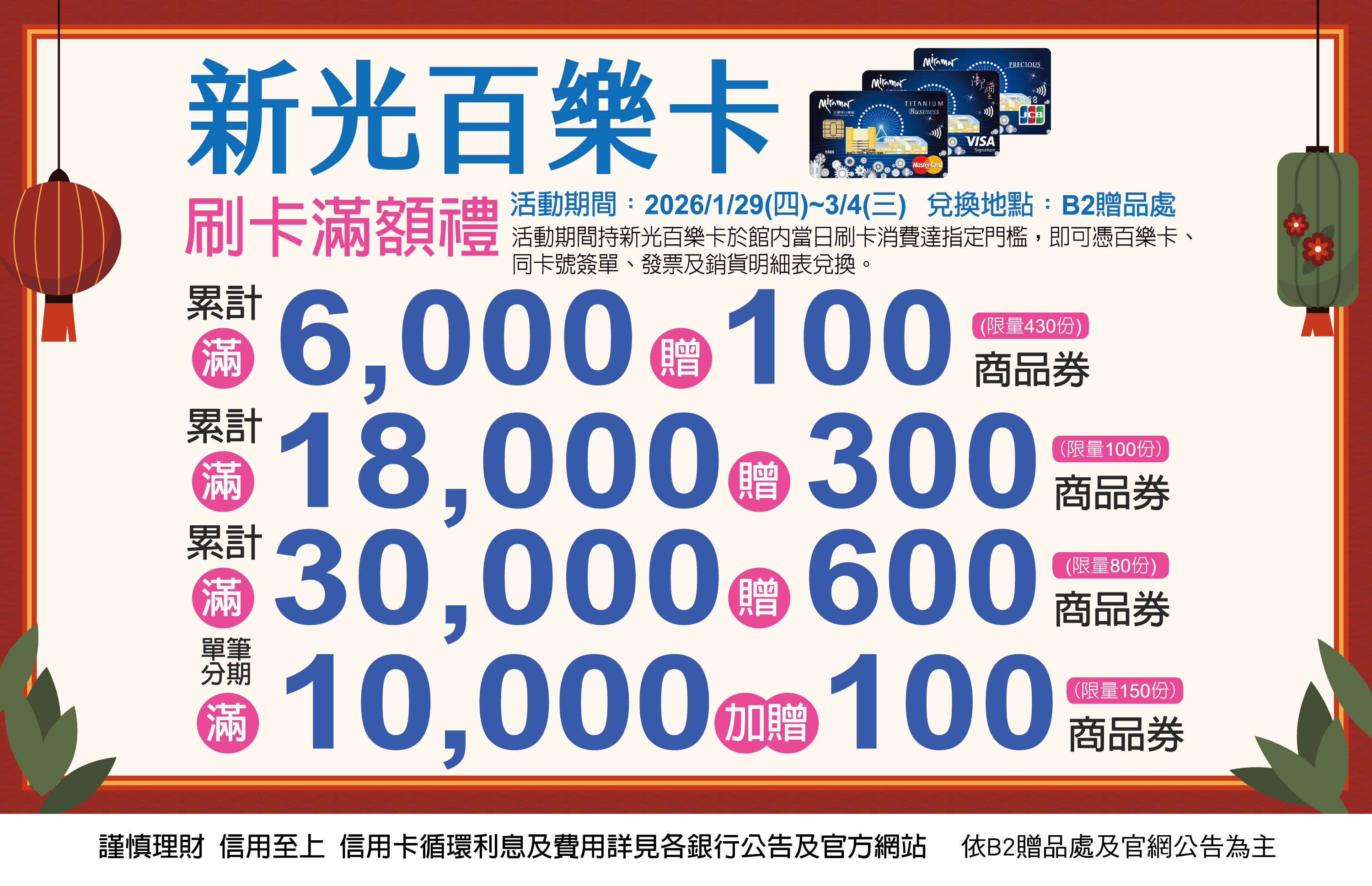 活動期間持新光百樂卡於館內當日刷卡消費達指定門檻,即可憑百樂卡、同卡號簽單、發票及銷貨明細表兌換。