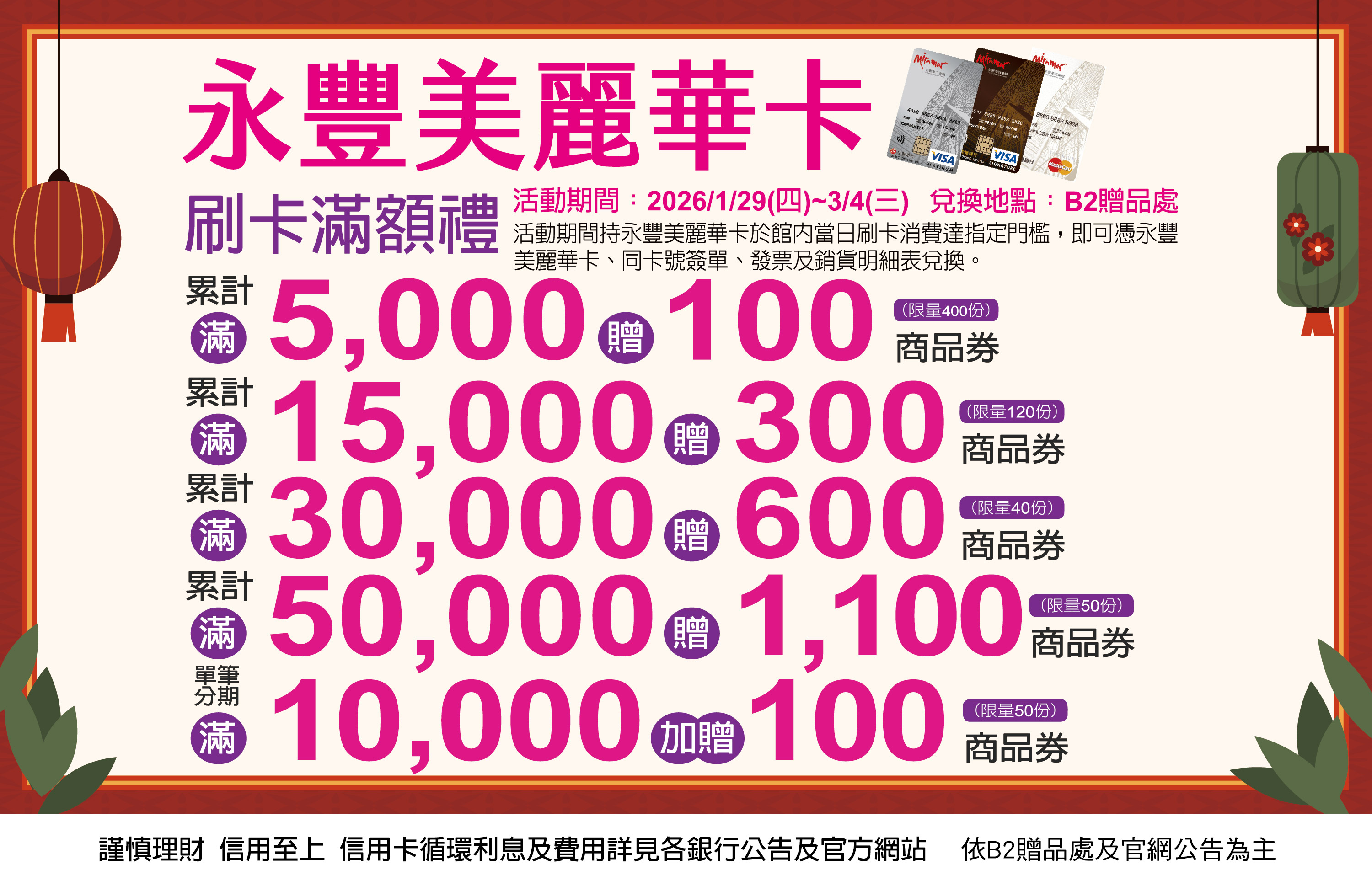 活動期間持永豐美麗華卡於館內當日刷卡消費達指定門檻,即可憑永豐美麗華卡、同卡號簽單、發票及銷貨明細表兌換。